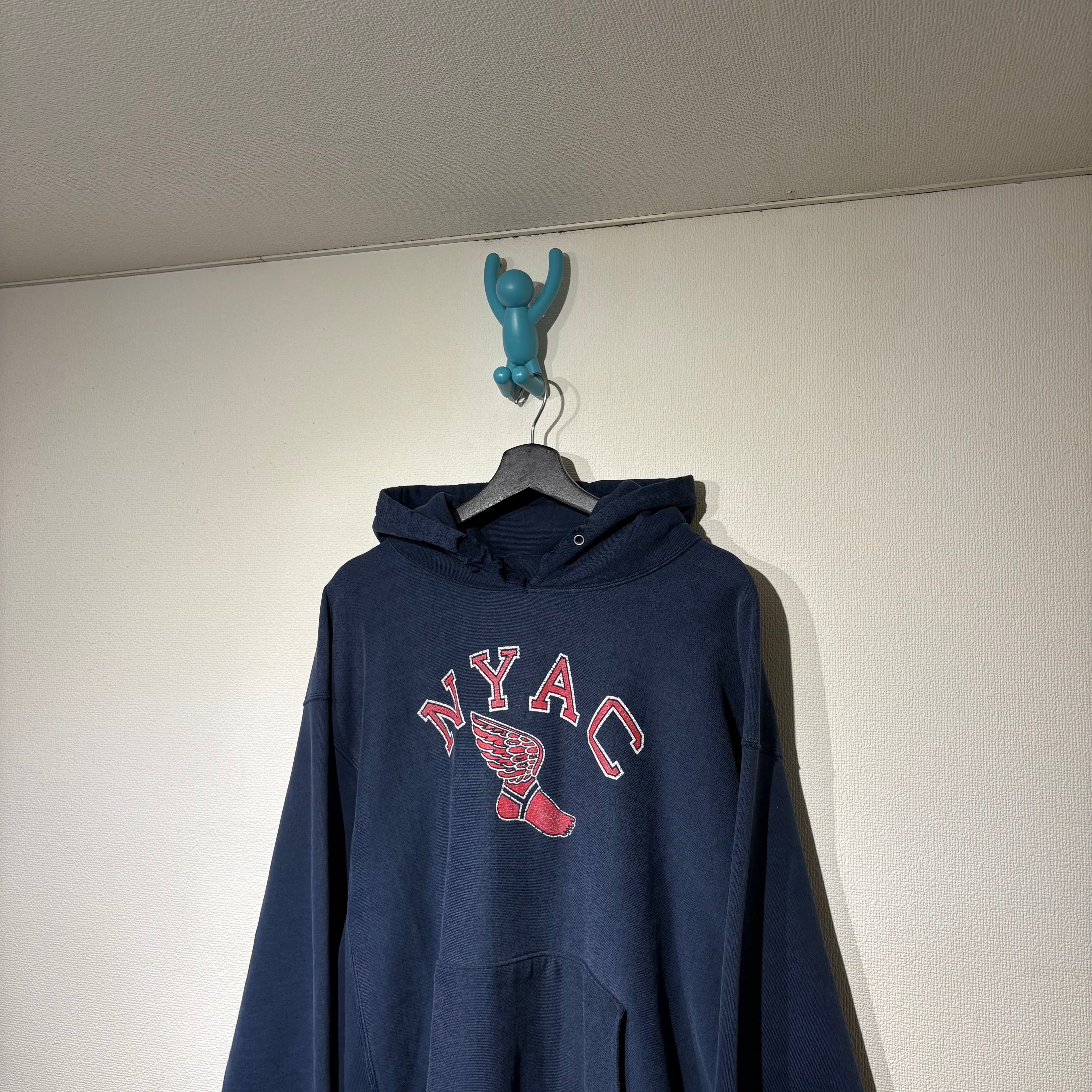 “Champion" 「wing foot」 90's〜00's navy×red cotton/poly printed L/S hoodie