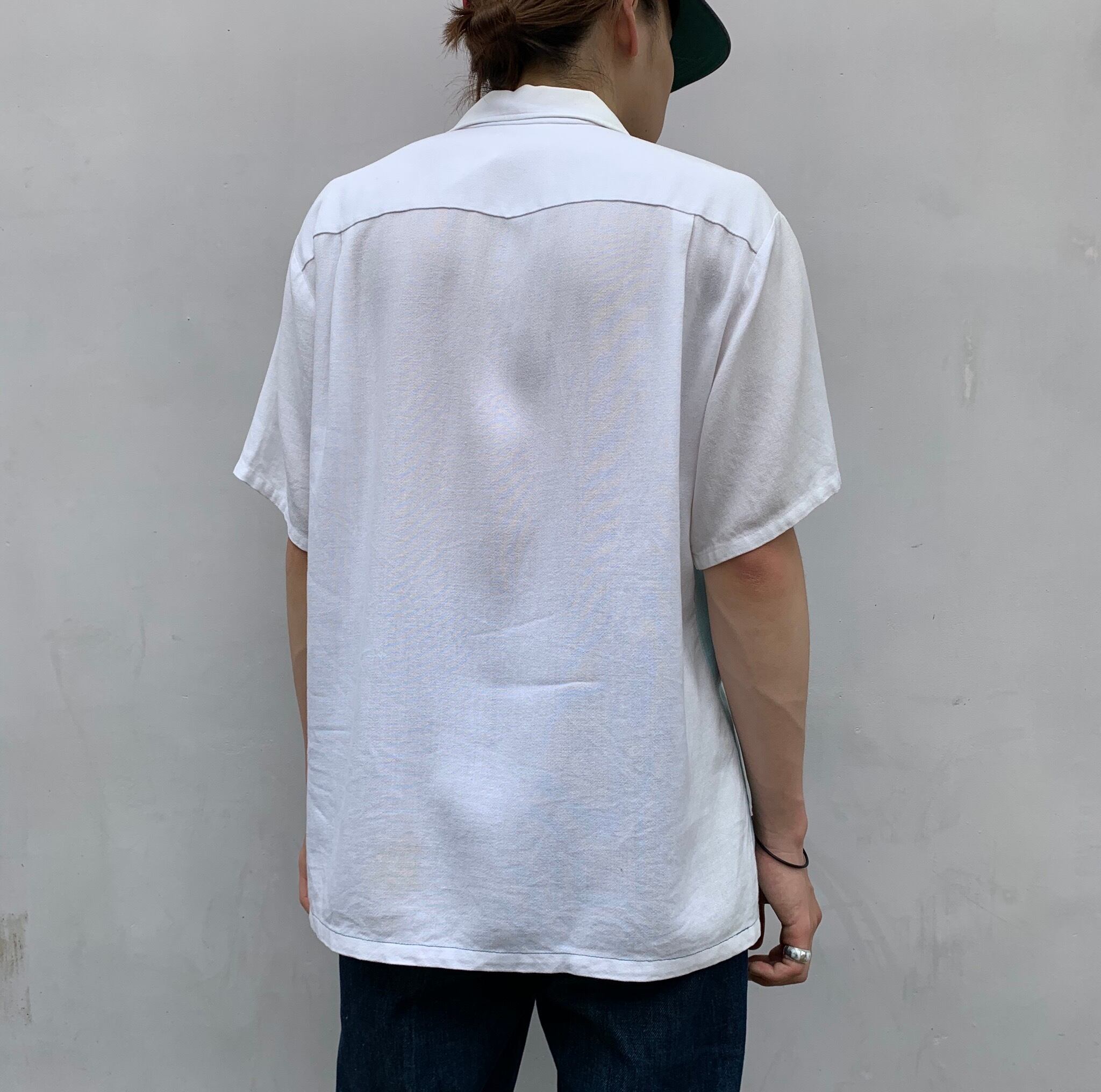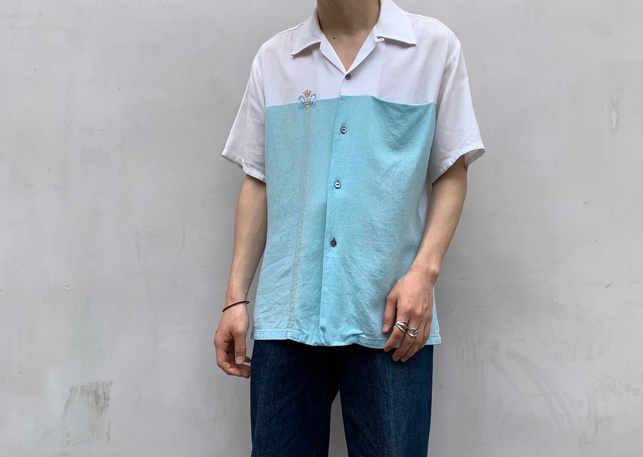 “ENCIO” 60’s vintage white×light blue design S/S open-collar shirt