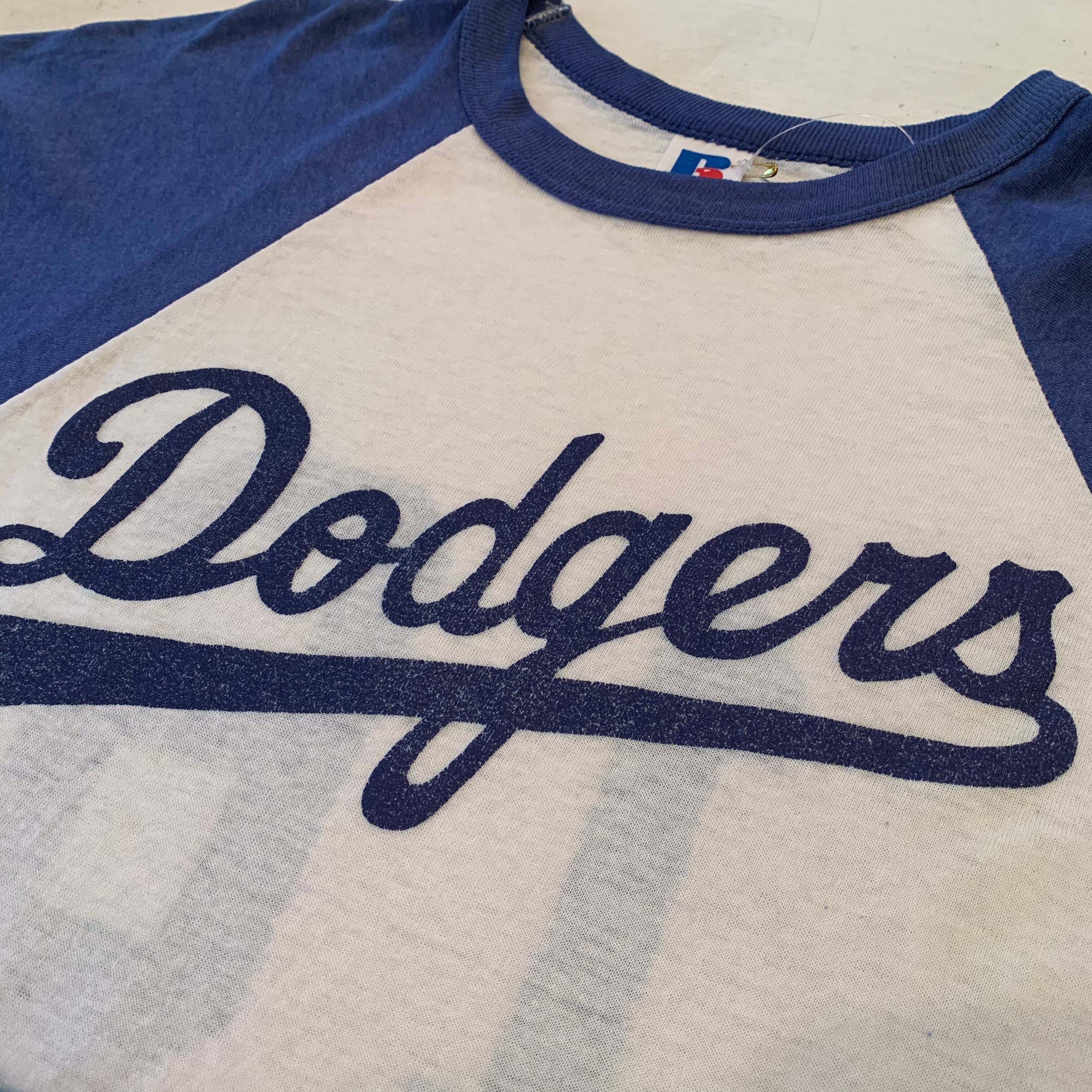 “RUSSEL ATHLETIC” 80’s~90’s 「Dodgers」white×blue printed raglan sleeve T-shirt