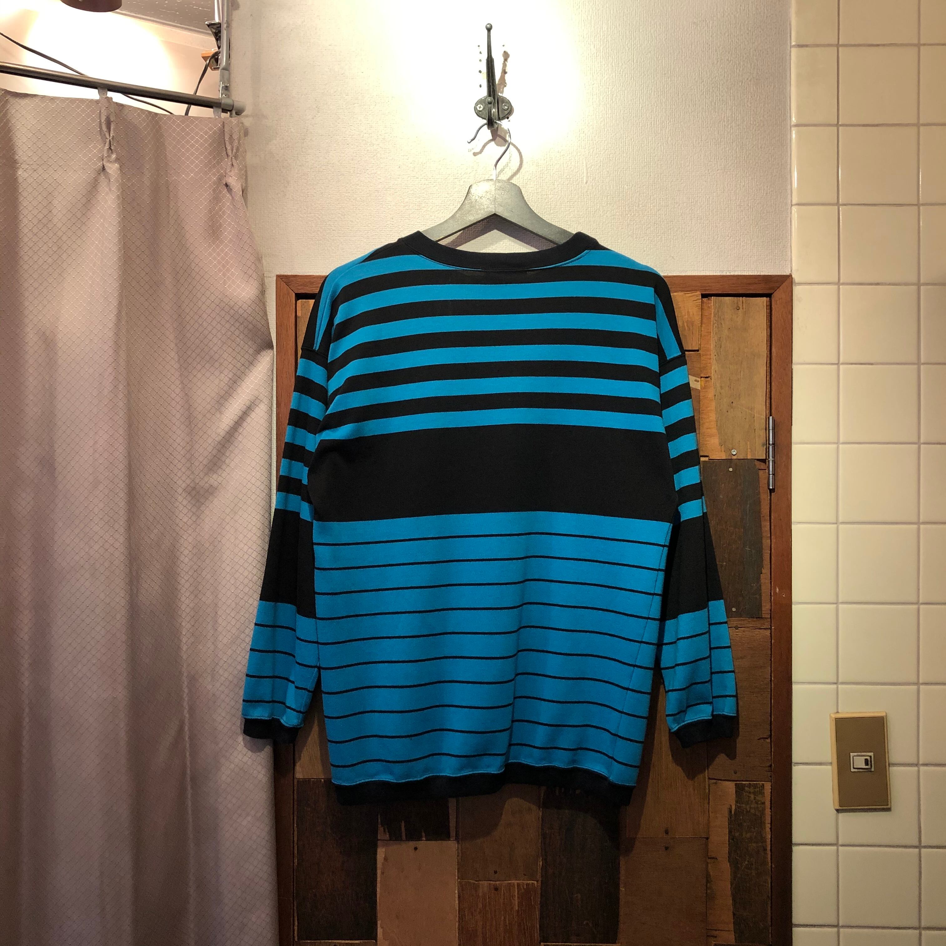 “BOUNDARY WATERS” Turquoise blue×black poly/cotton L/S mix border tee