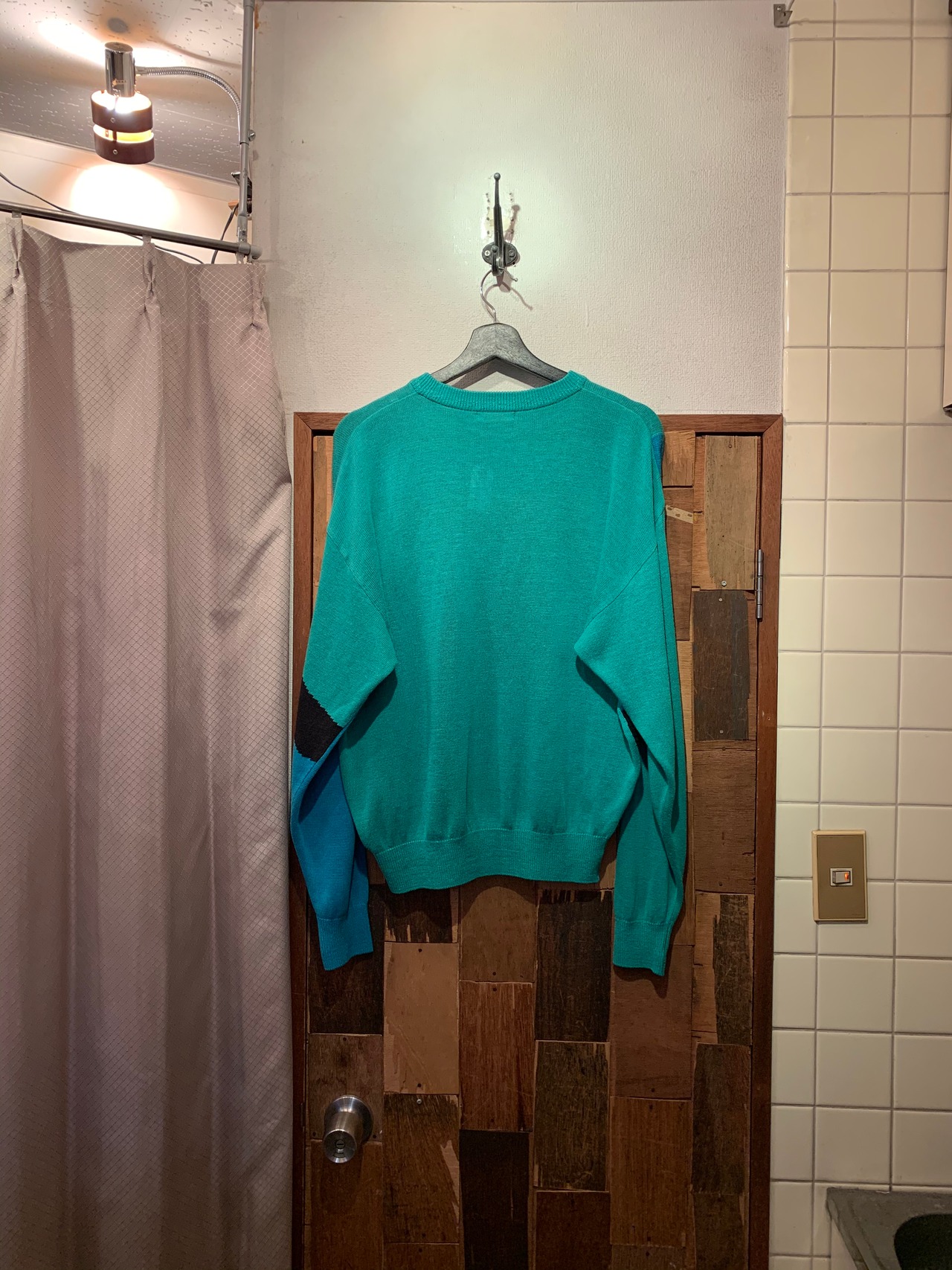 “LANCEL” emerald green×turquoise blue embroidery design knit sweater