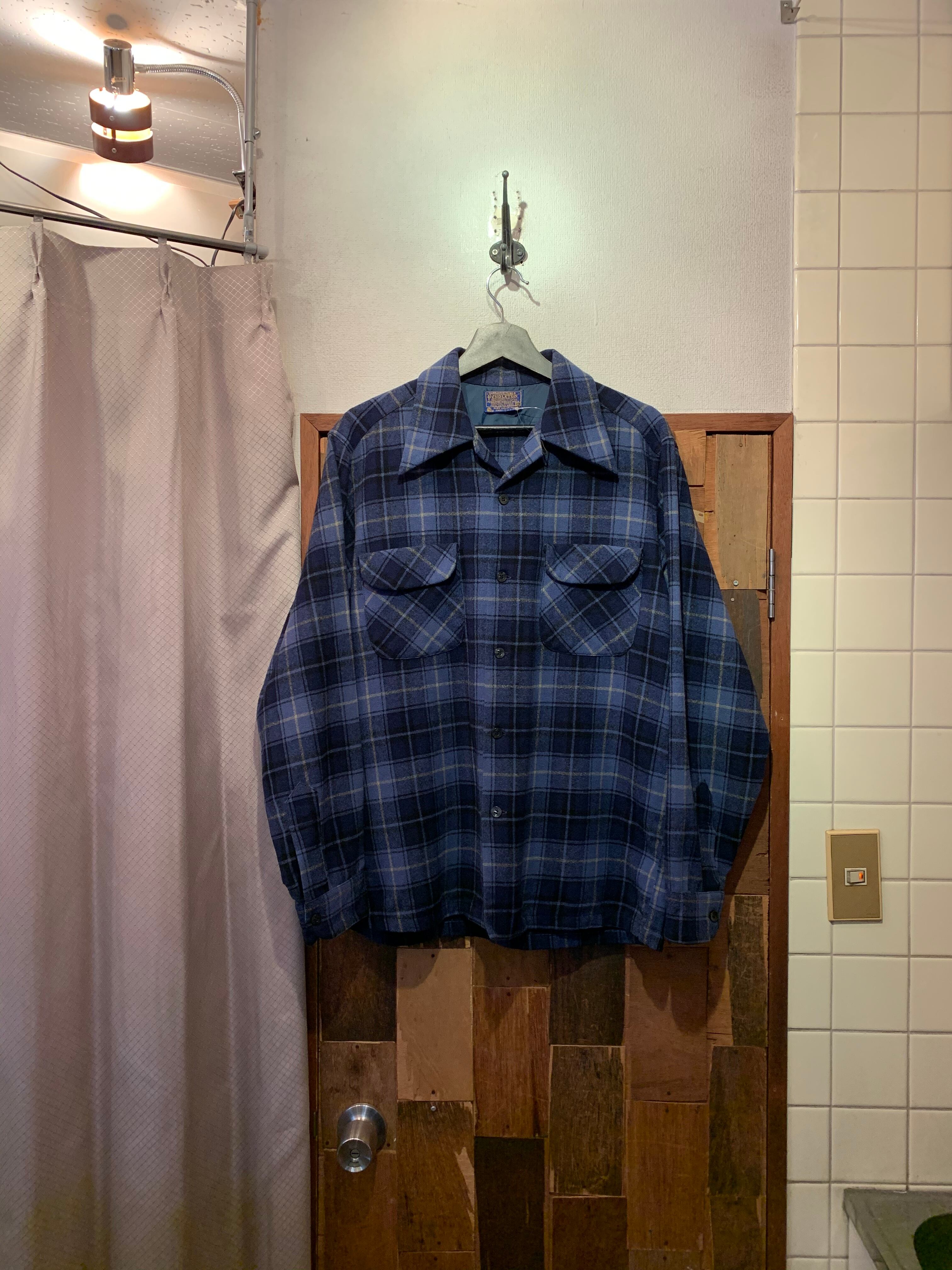 “PENDLETON” 70’s vintage lavender blue×navy wool check pattern L/S open-collar shirt