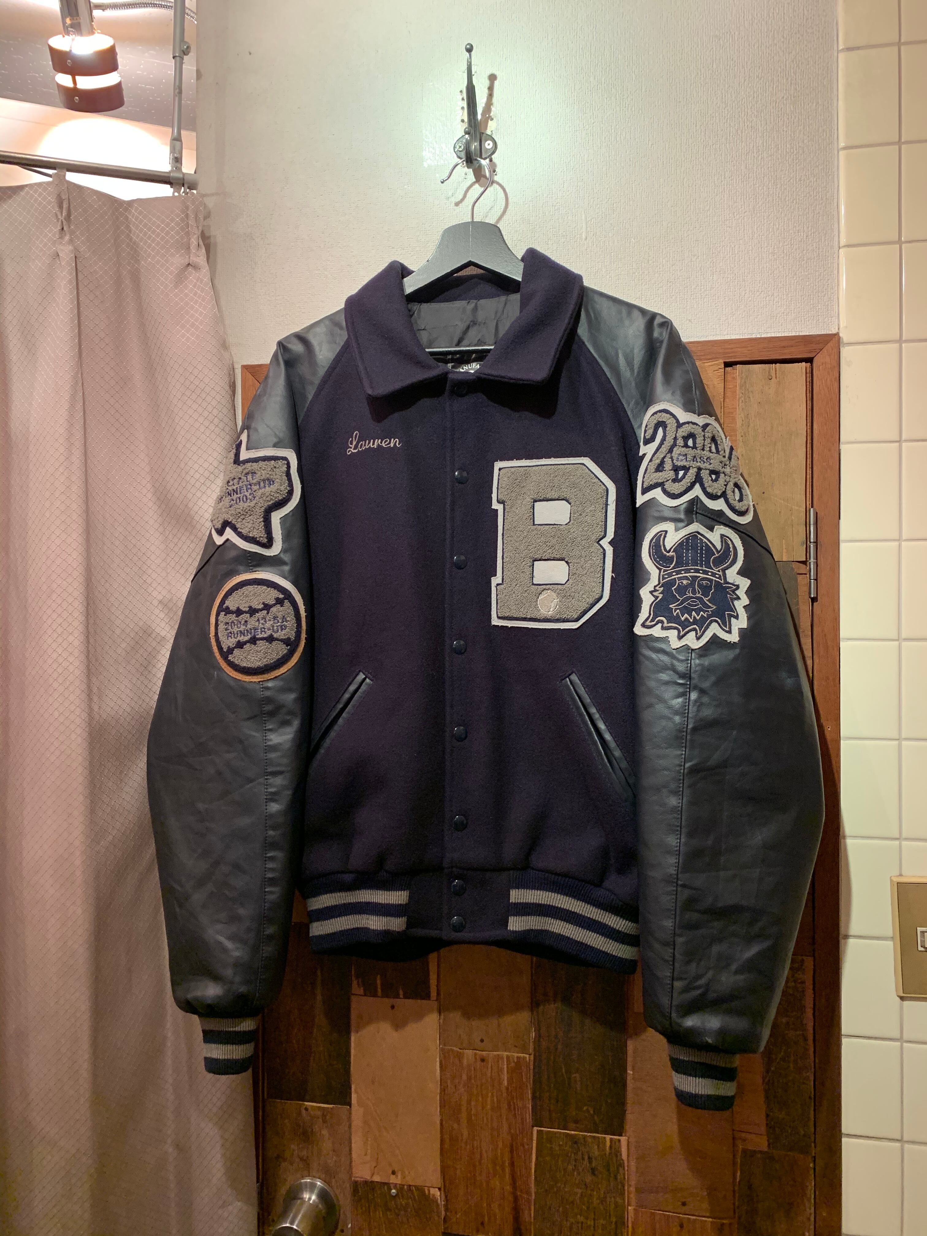 “TEJAS MANUFACTURING” 00’s navy sleeve leather stadium jumper