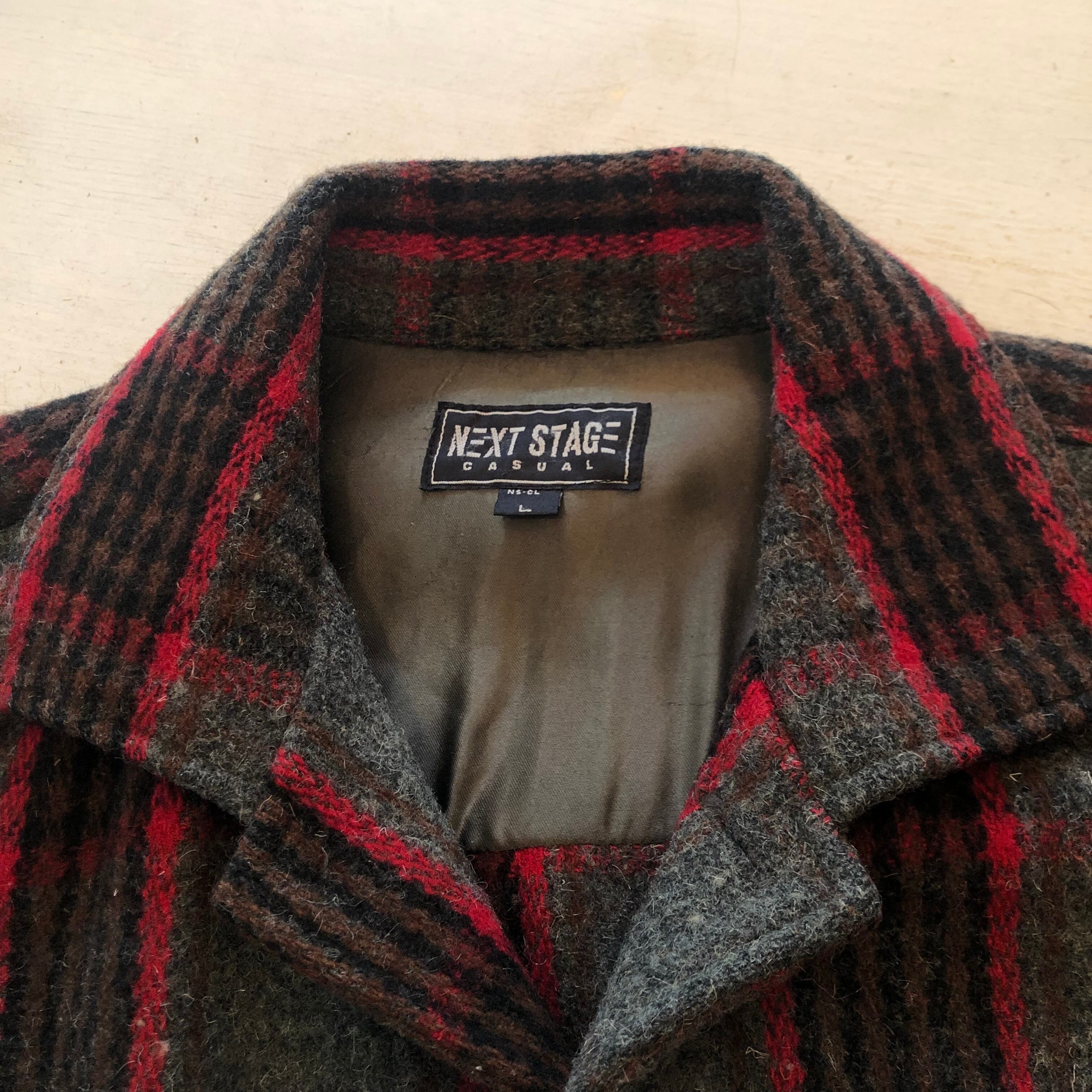 “NEXT STAGE” dark gray×red wool/rayon check pattern design shirt jacket
