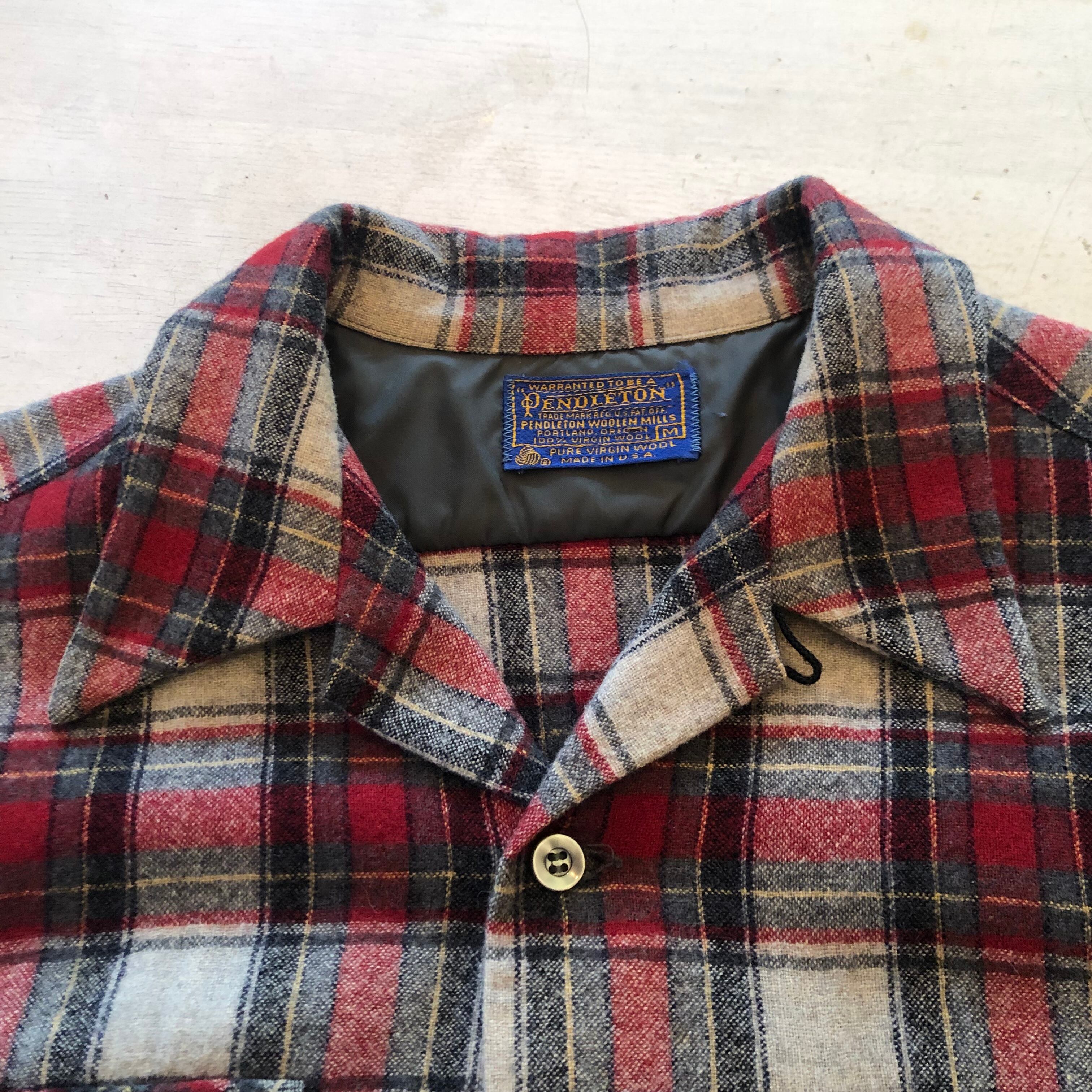 “PENDLETON”70's~ vintage light gray×chacoal gray×red wool check pattern L/S opene-collar shirt