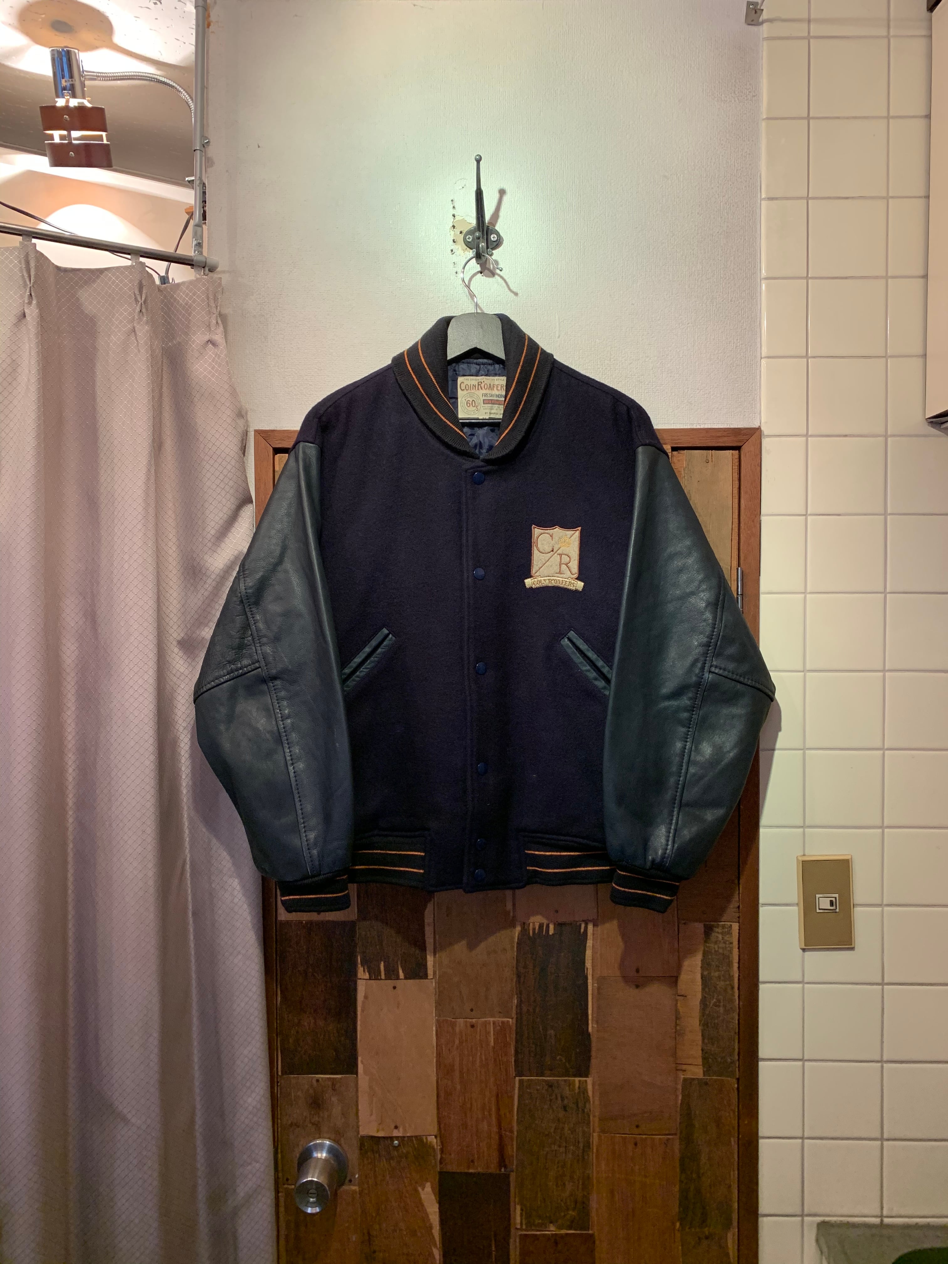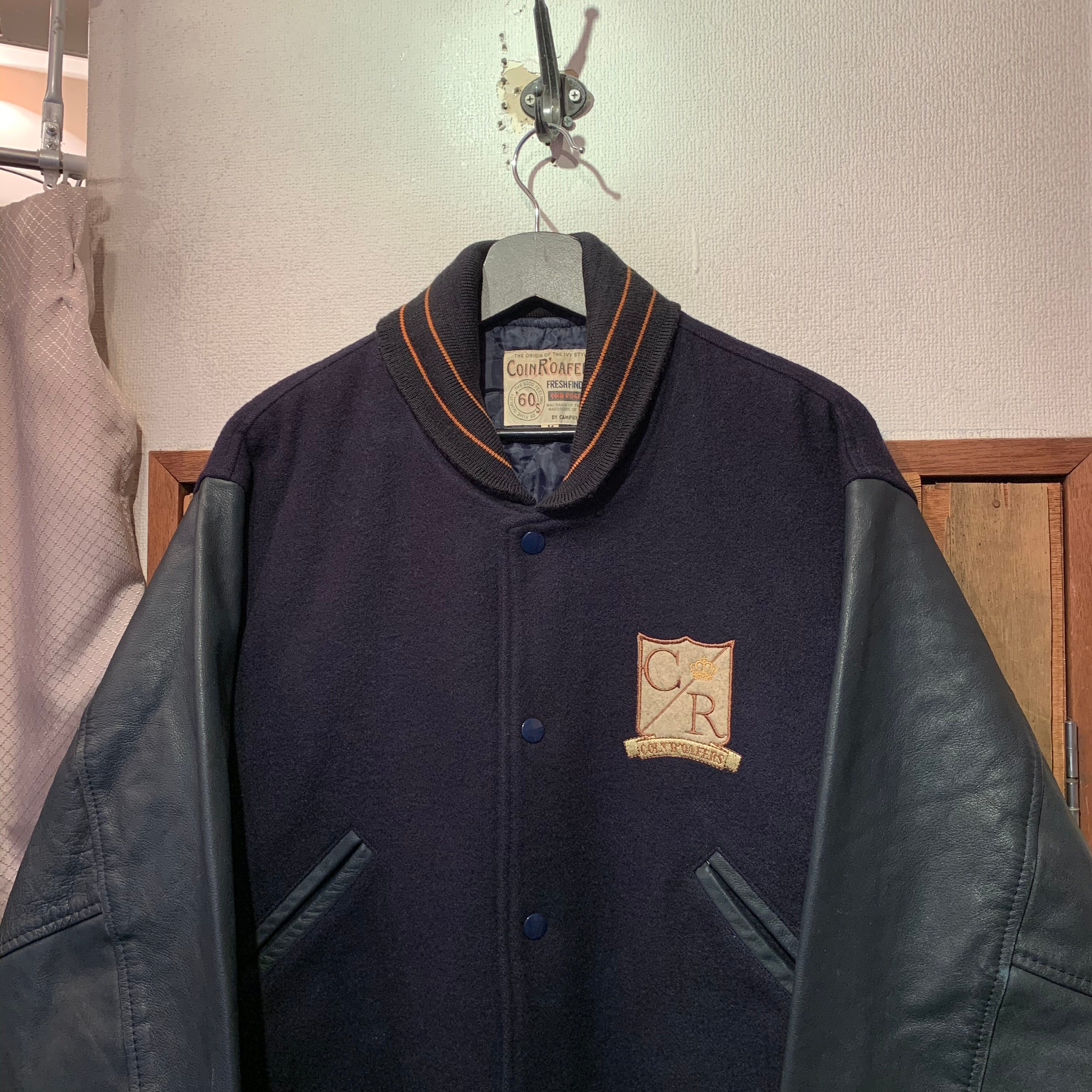 “COUN R’OAFERS” dark navy leather sleeve shawl-collar stadium jumper