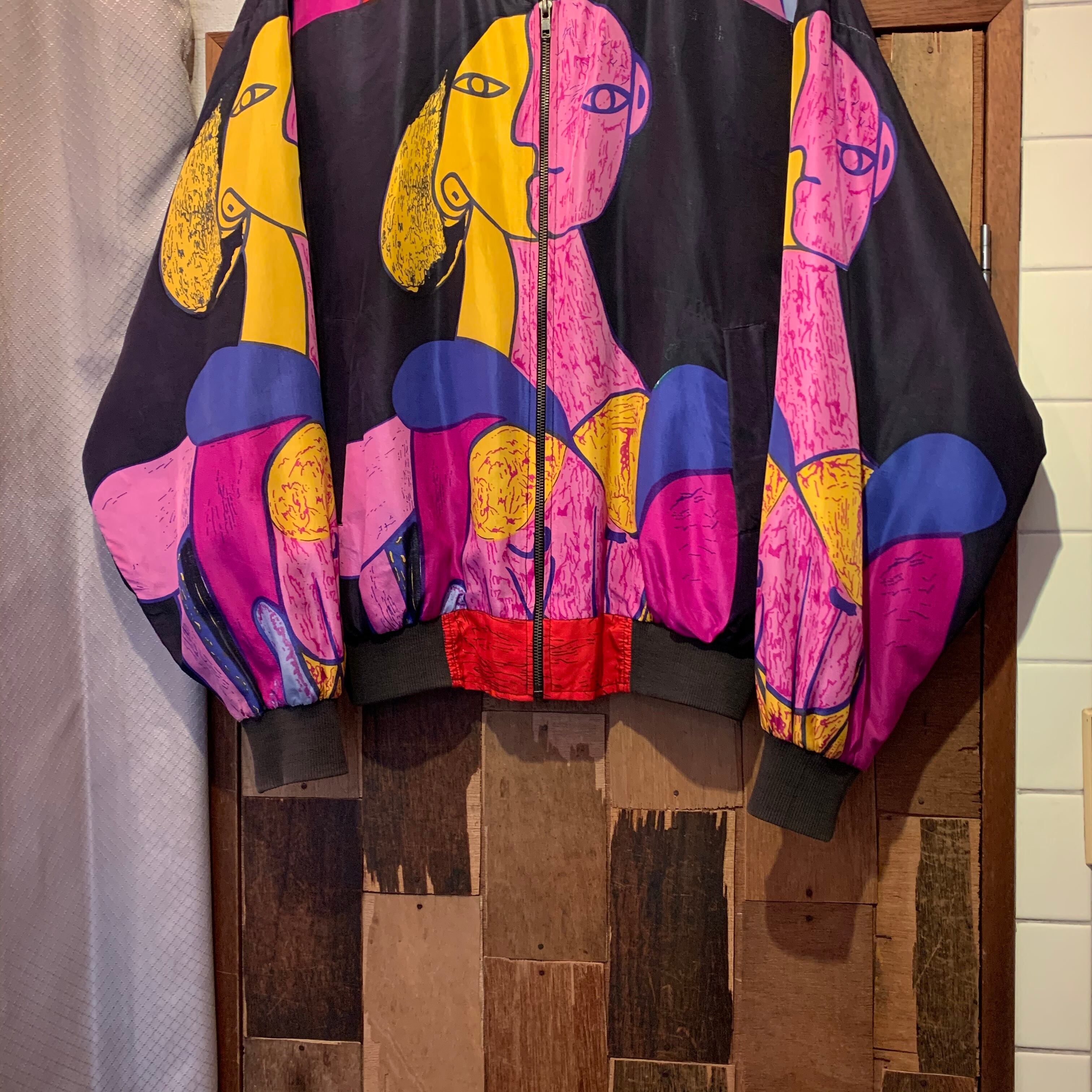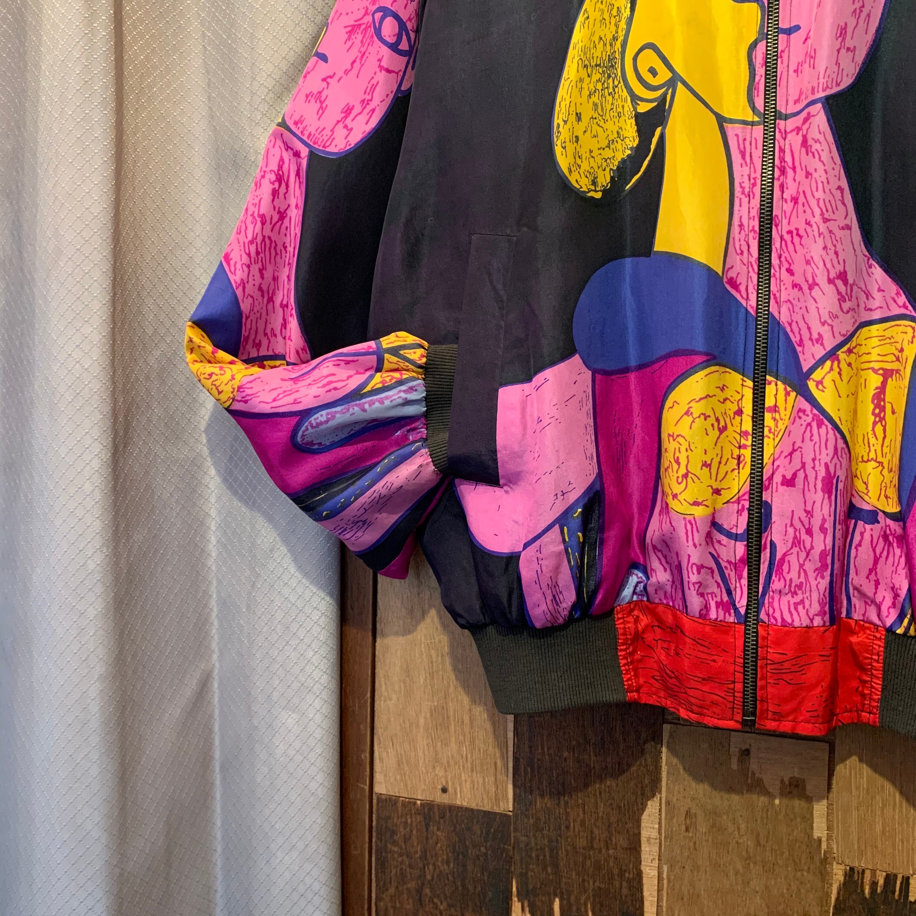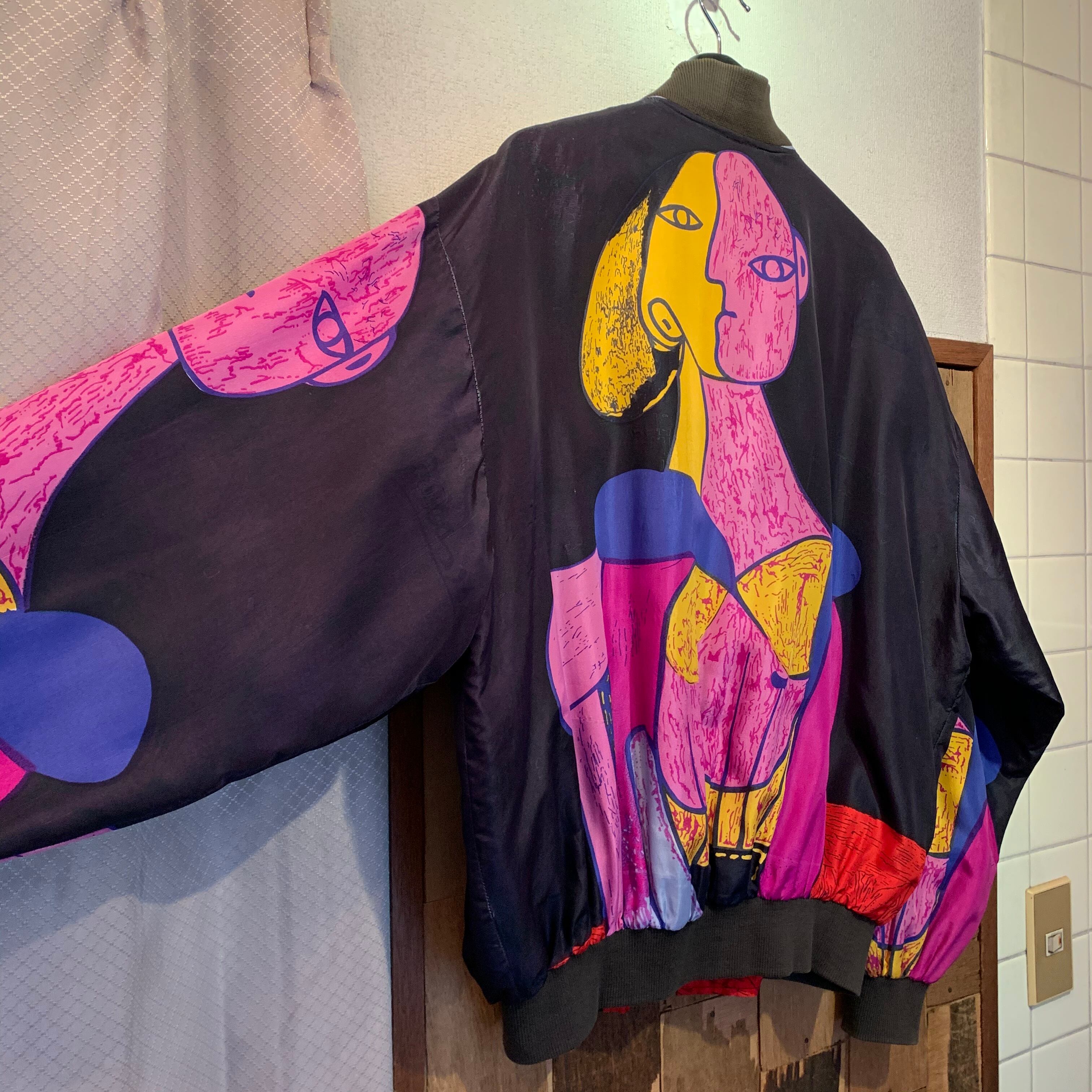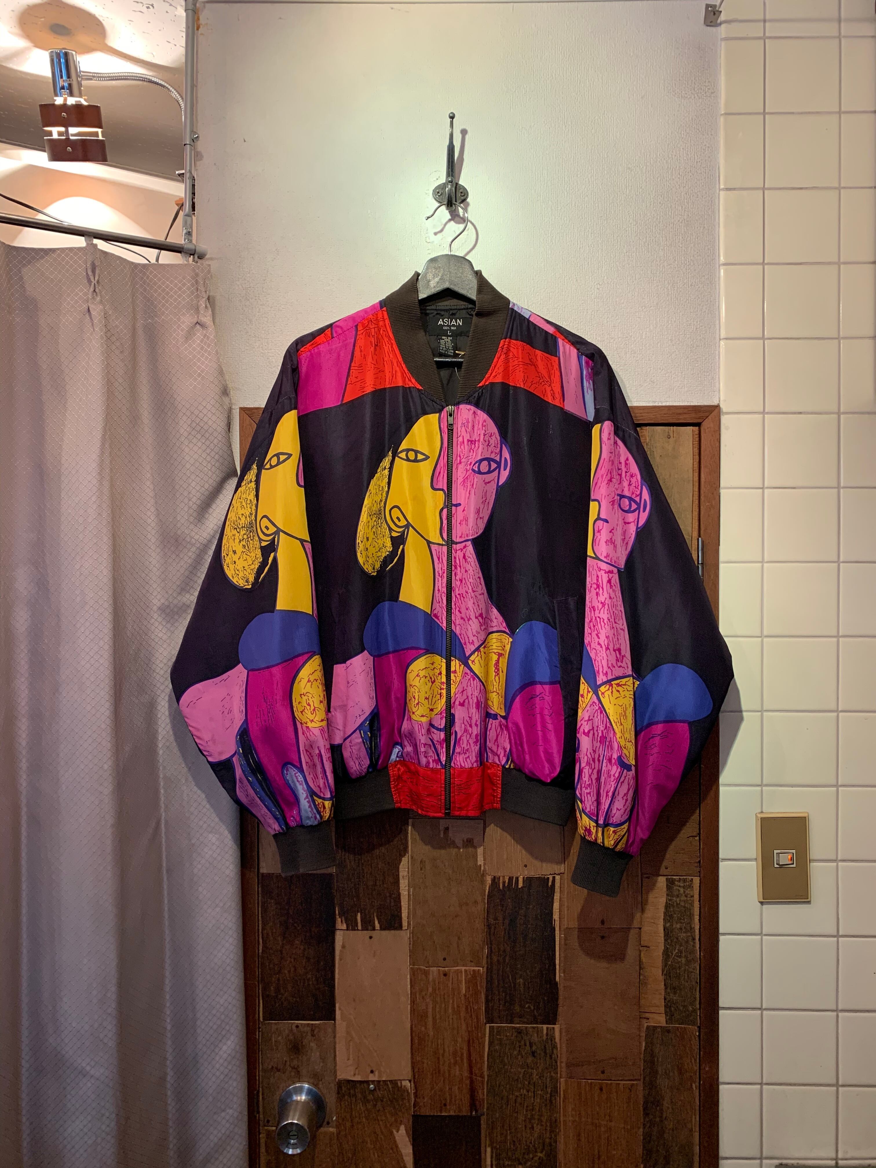 “ASIAN”「ピカソ」black base silk art pattern zip-up blouson