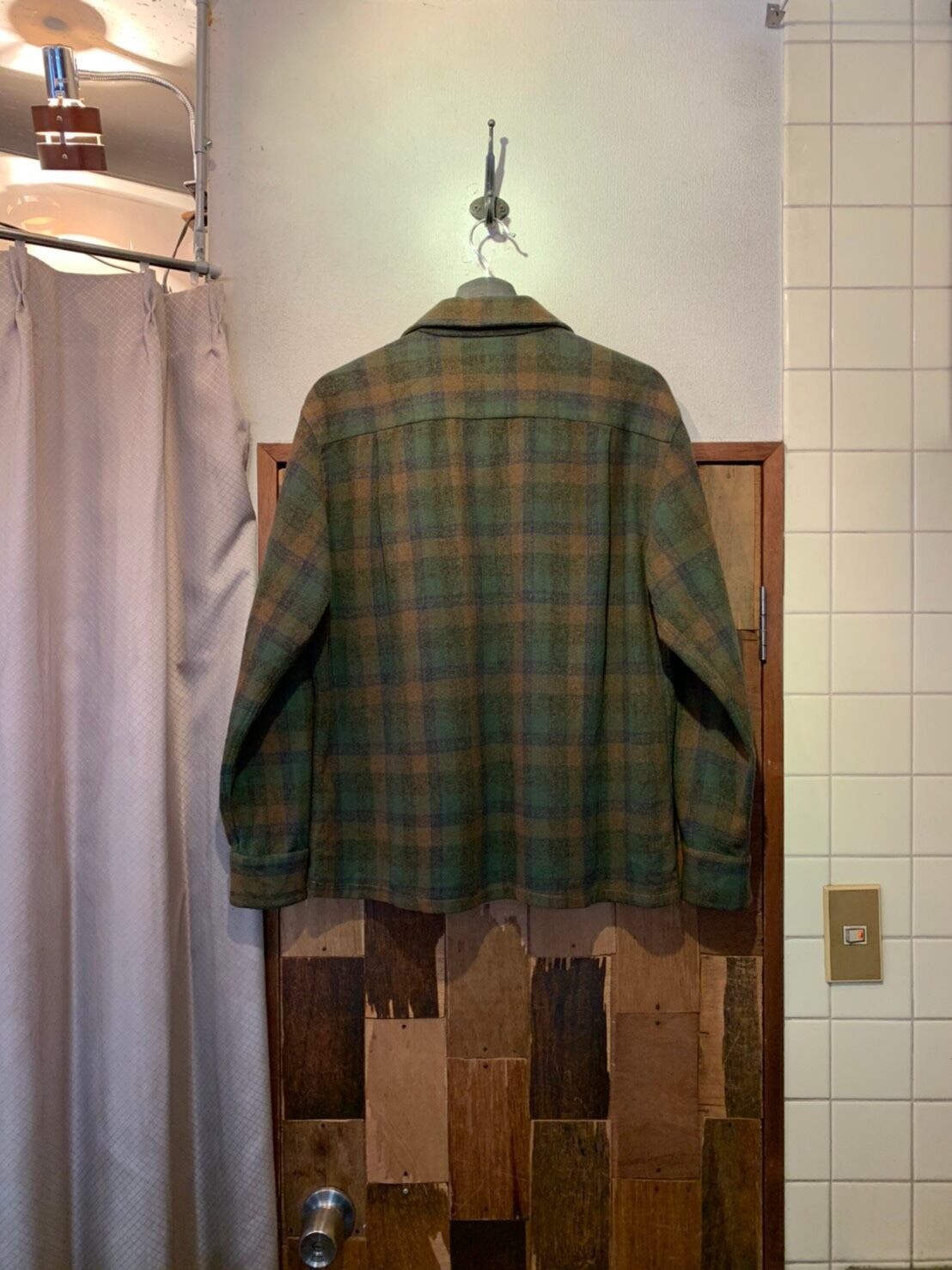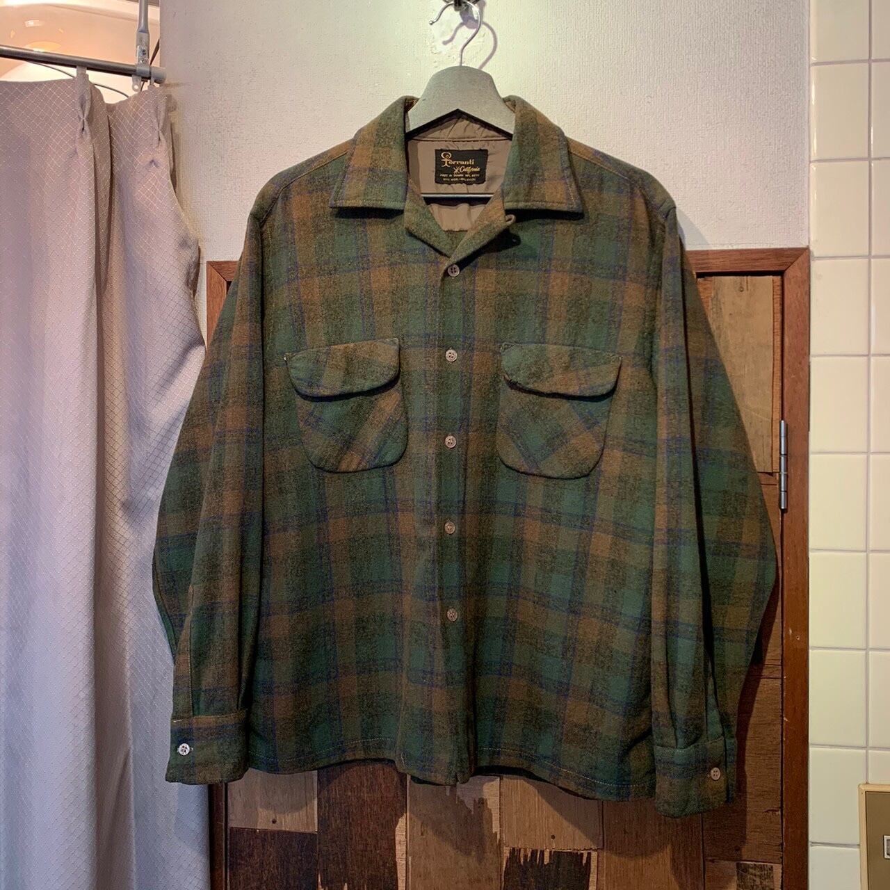 “Terranti California” 60's~vintage moss green×brown check pattern L/S open-collar shirt