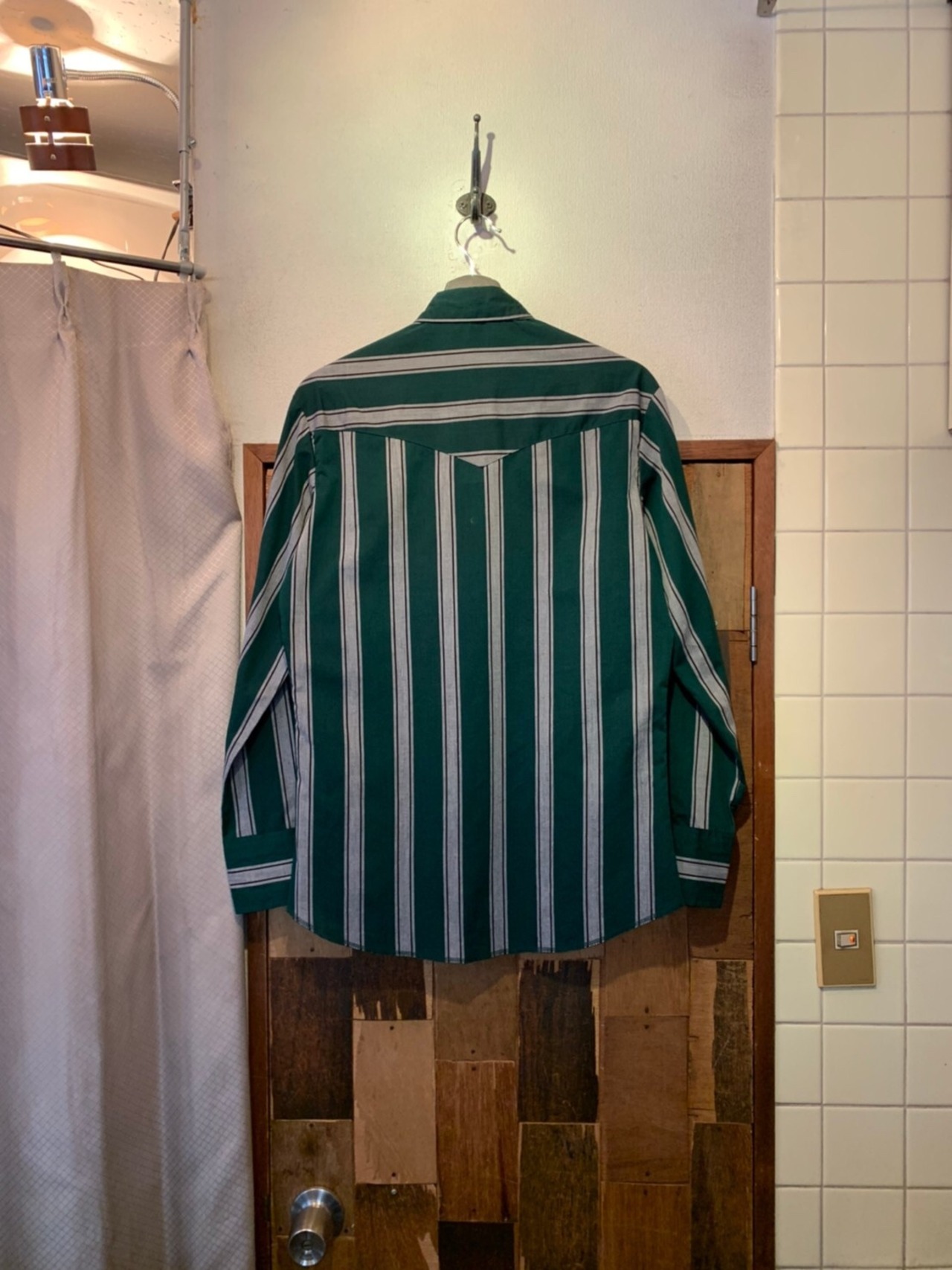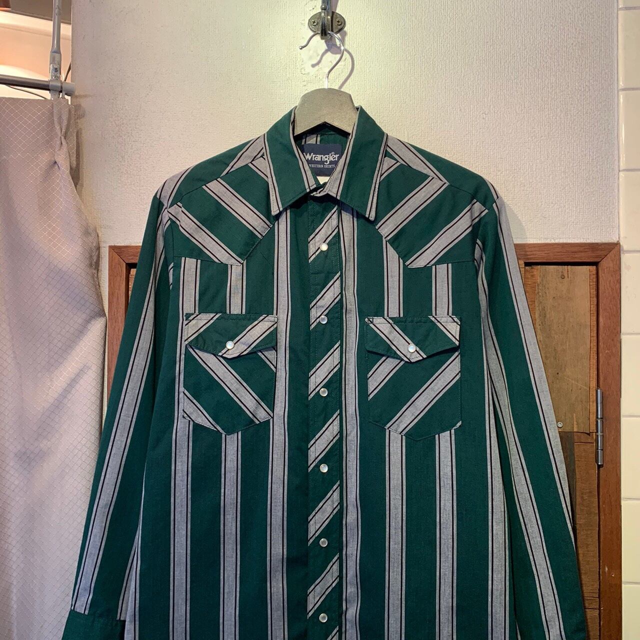 “Wrangler” moss green base cotton/poly unique stripe pattern L/S western shirt