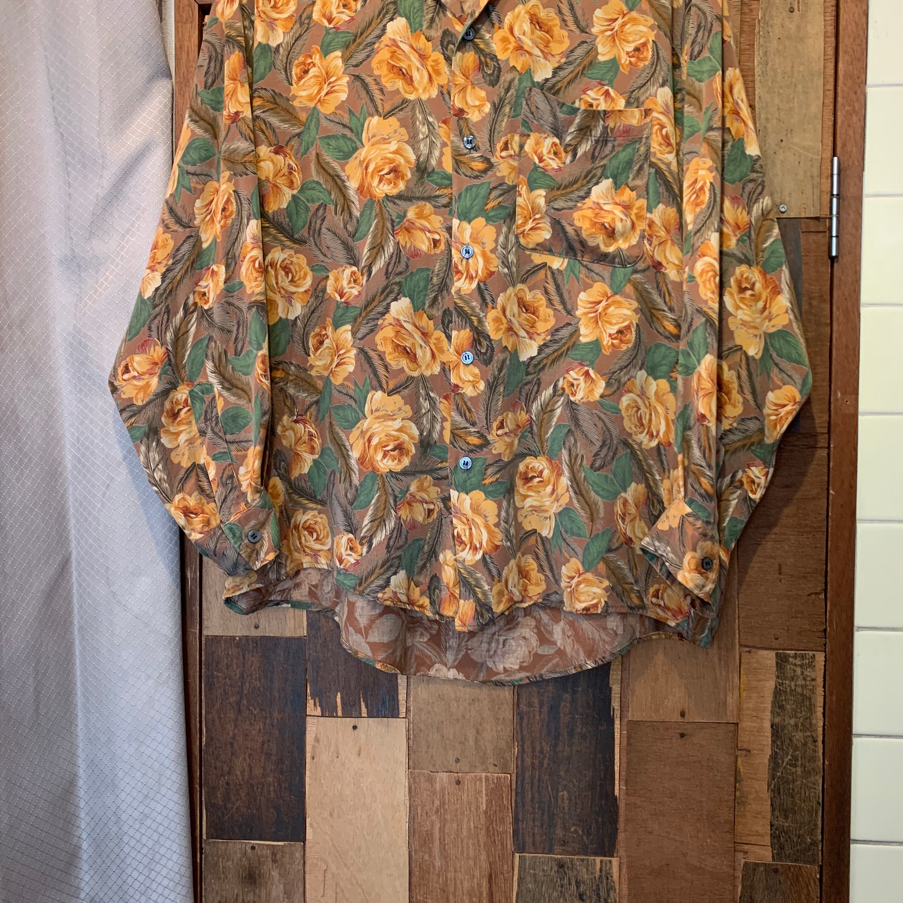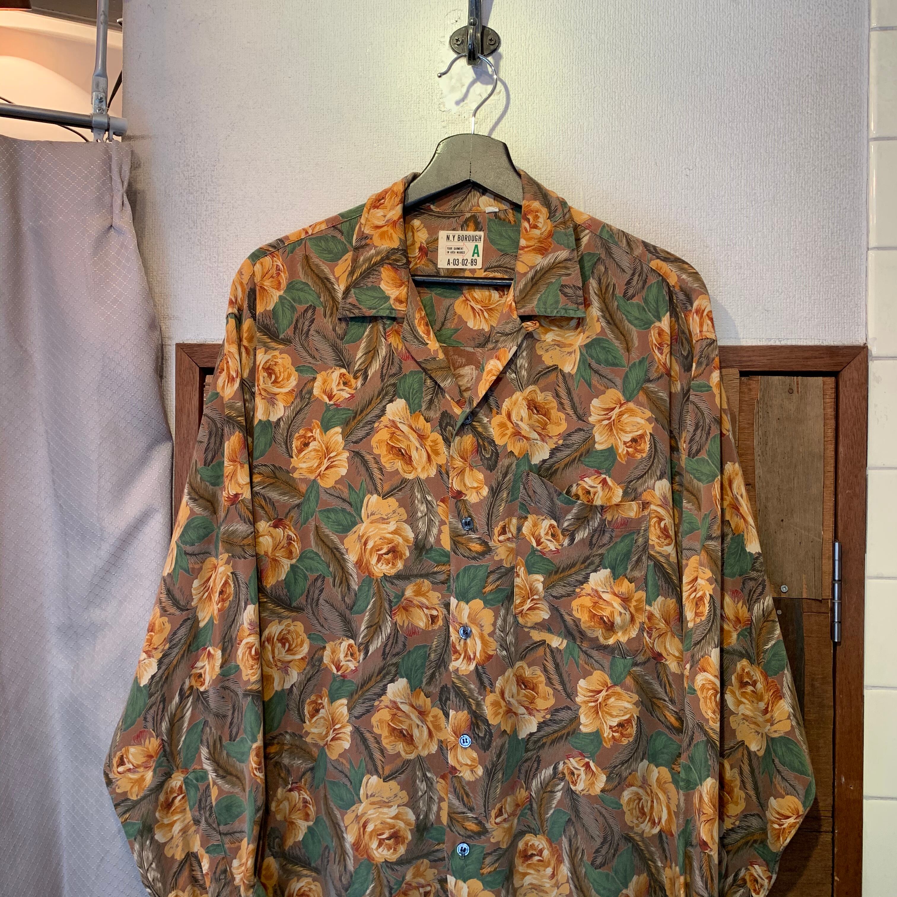 “N.Y BROUGH” brown base rayon flower pattern L/S open-collar shirt