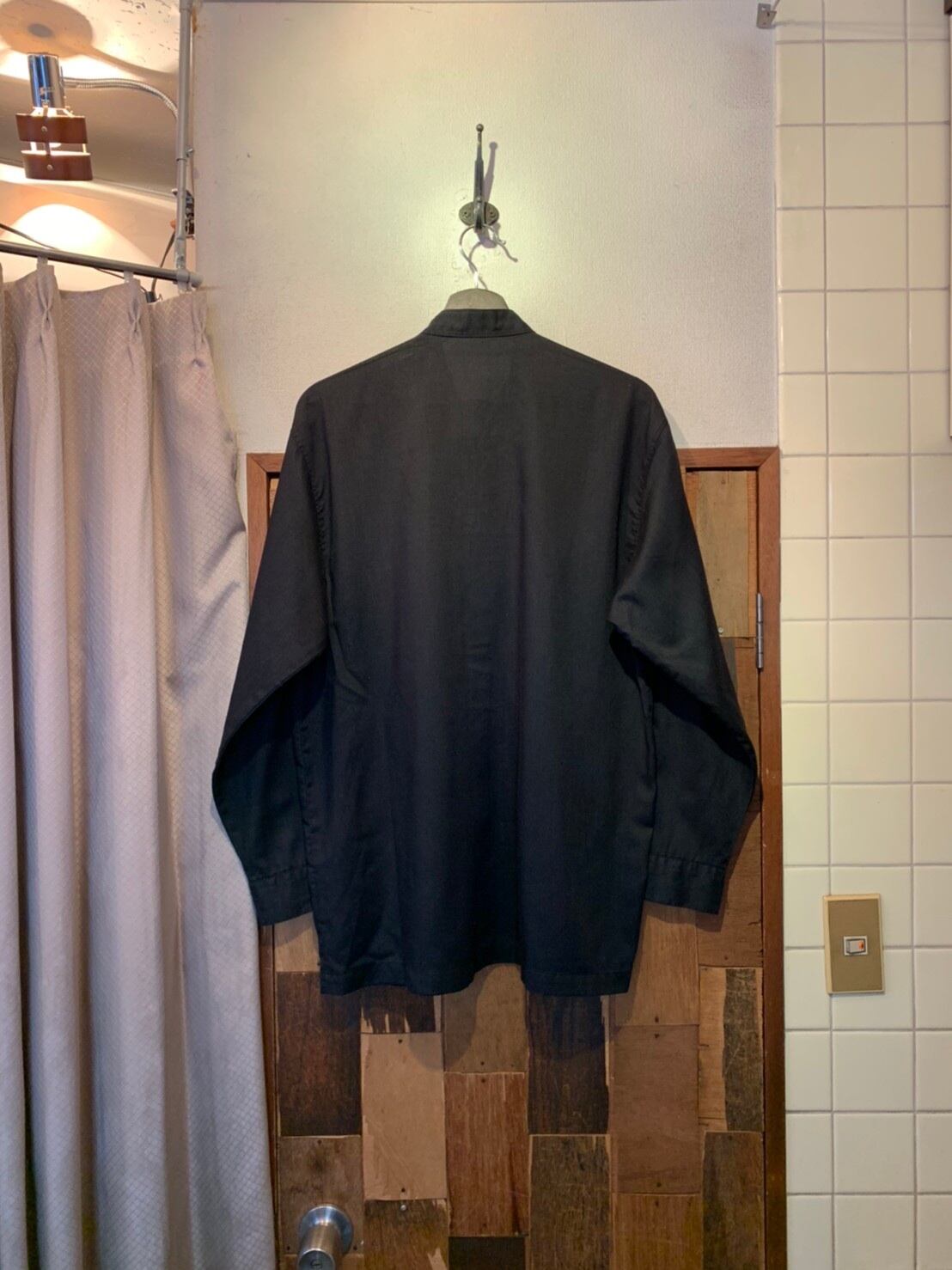 “BEA FIVE” black poly/linen embroidery design L/S band-collar shirt