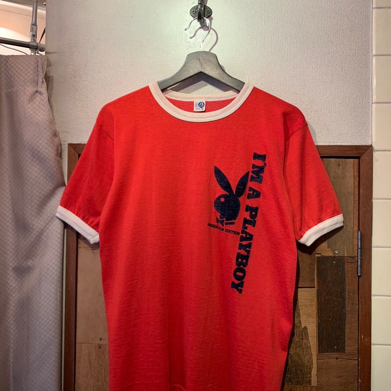 “ARTEX”「PLAY BOY」70's~80's U.S.A red×white nylon/cotton flocky printed S/S ringer T-shirt