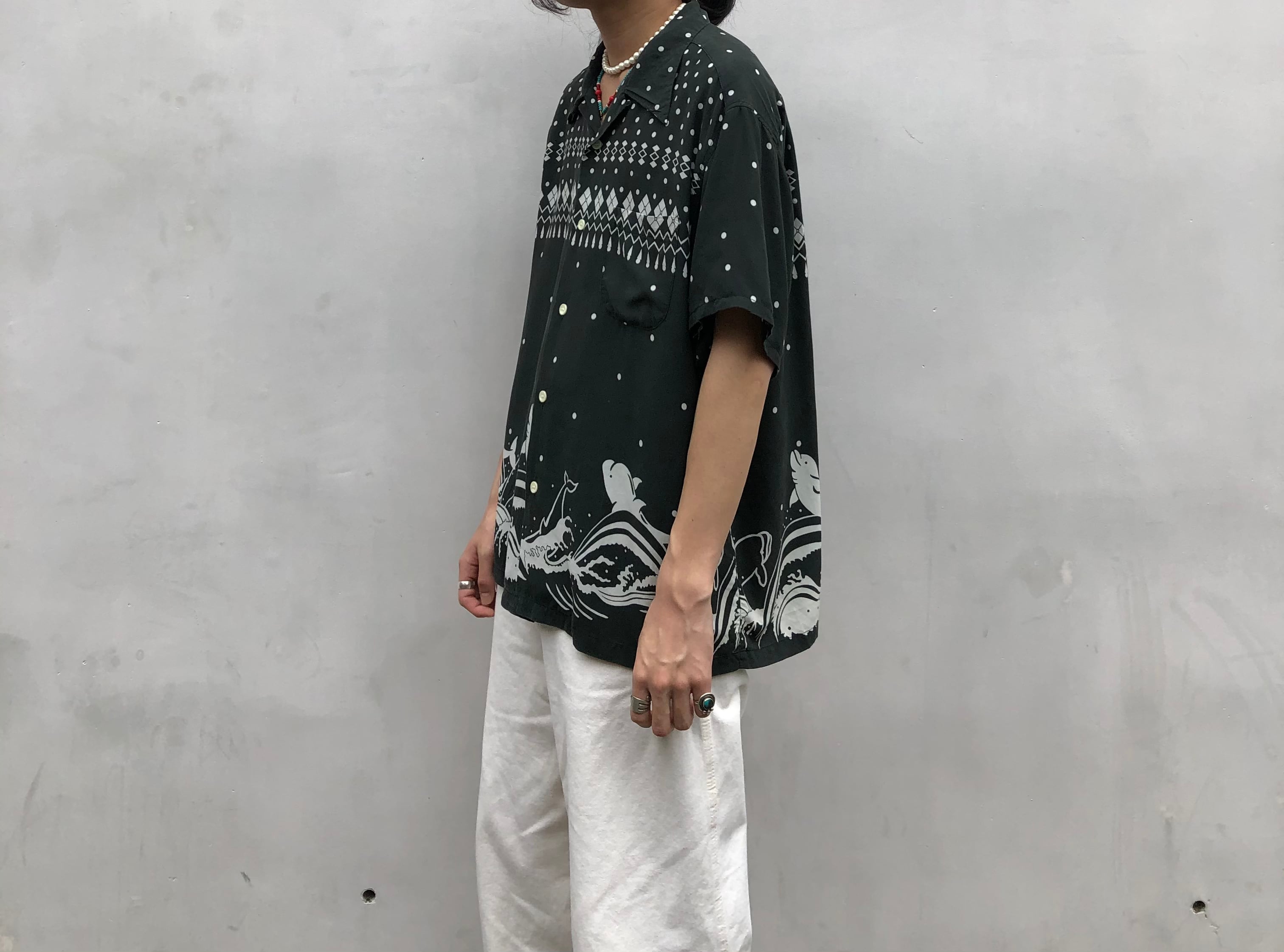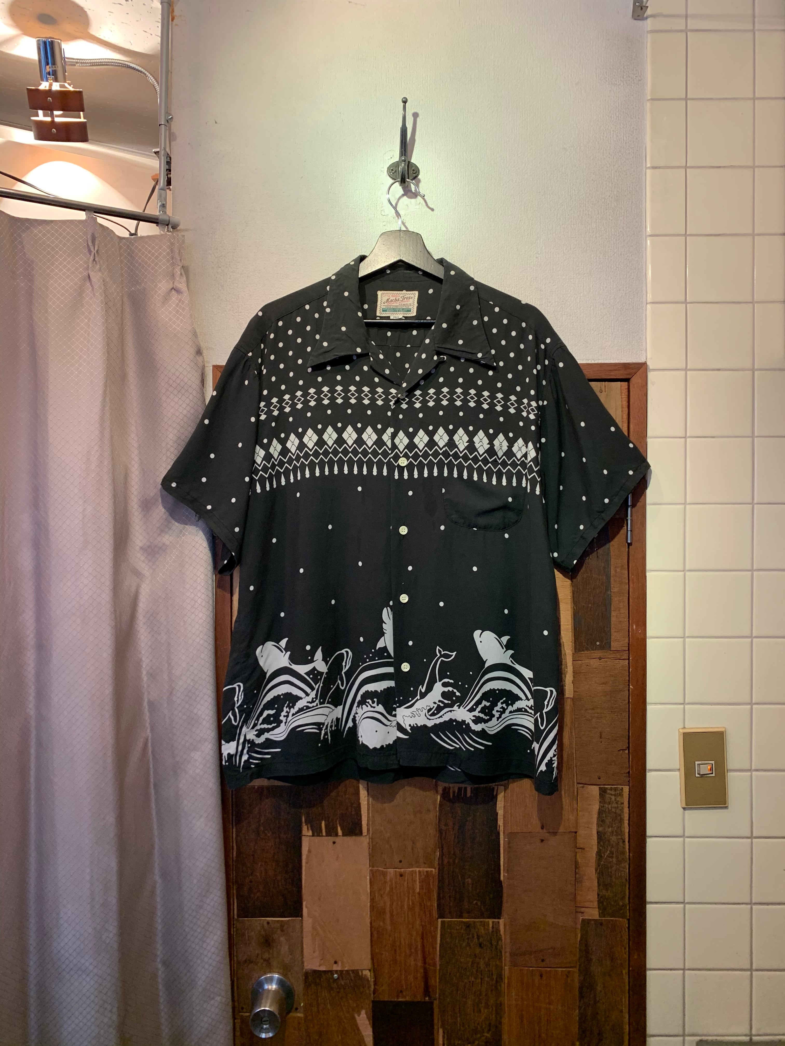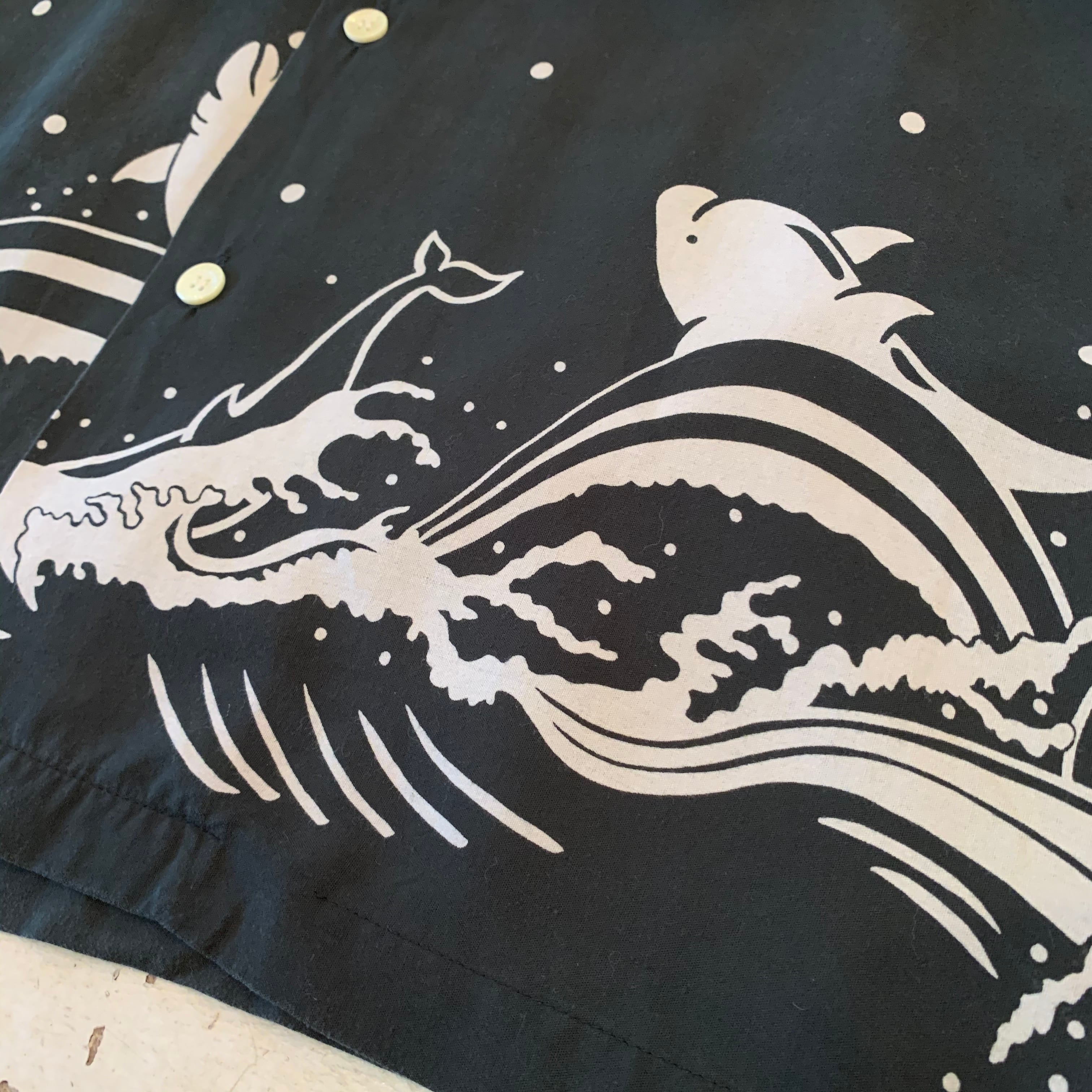 “Macba Tros” black rayon dolphin pattern S/S open-collar shirt