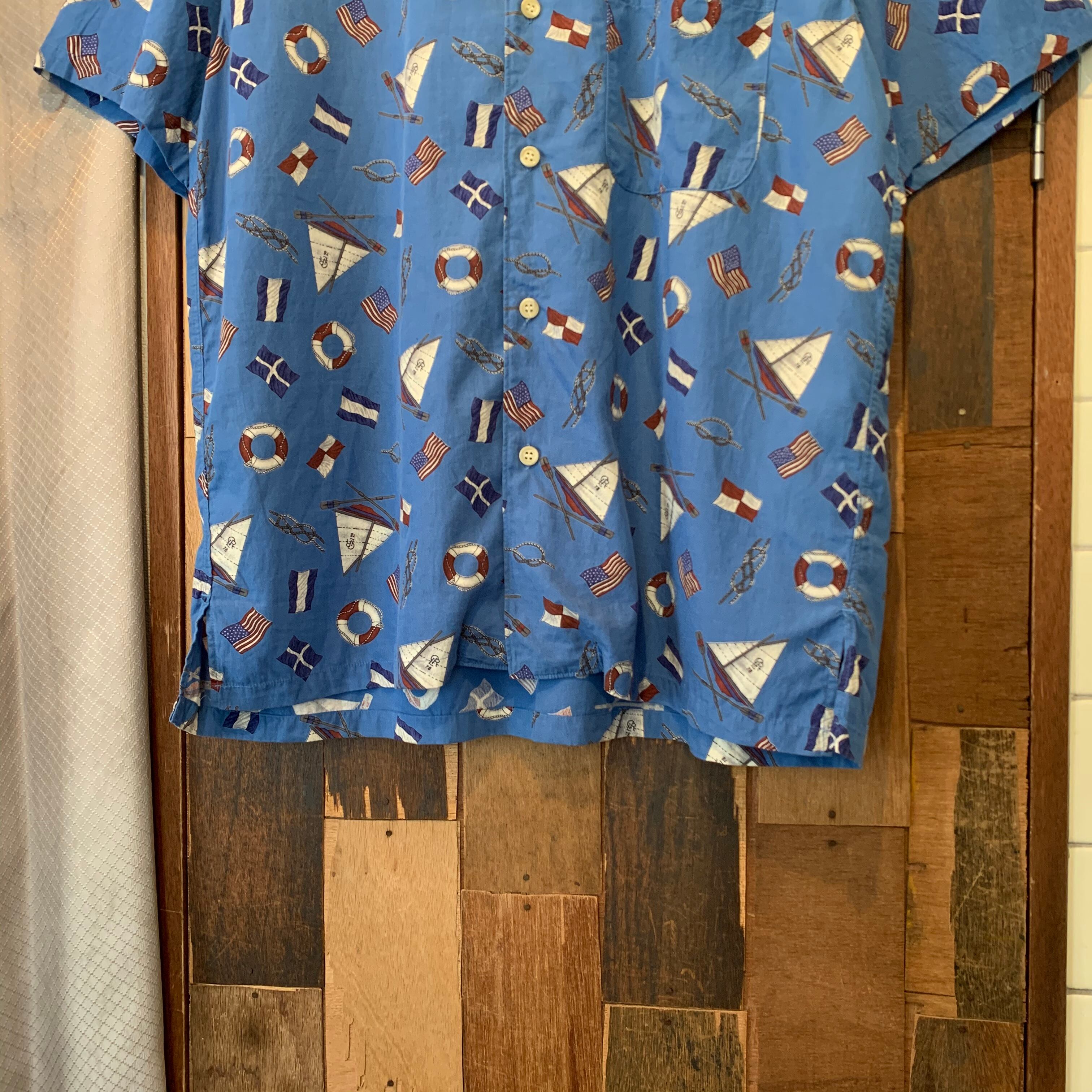 “CHAPS” 80’s blue rayon/cotton repeating pattern S/S open-collar shirt