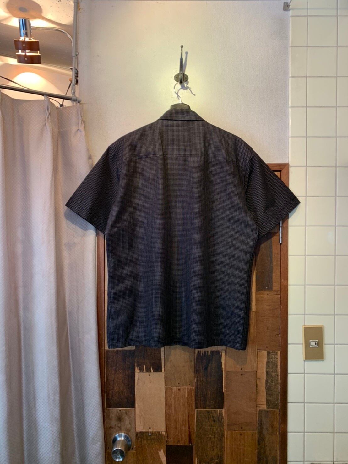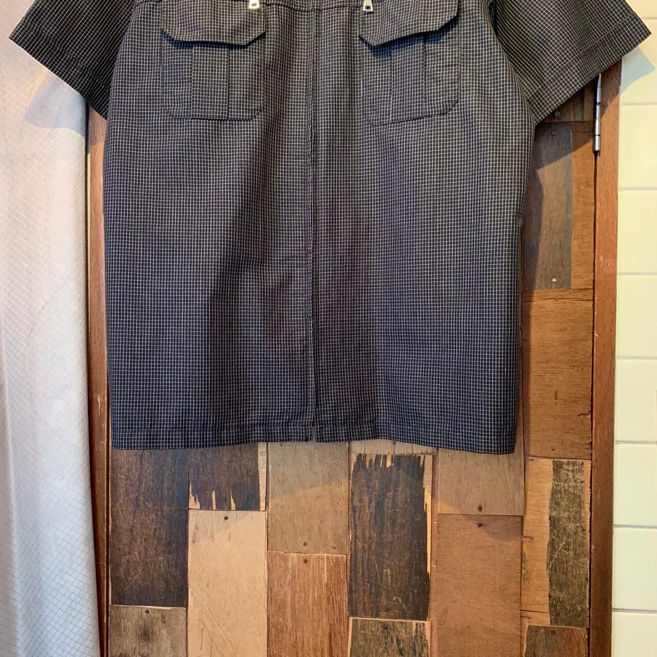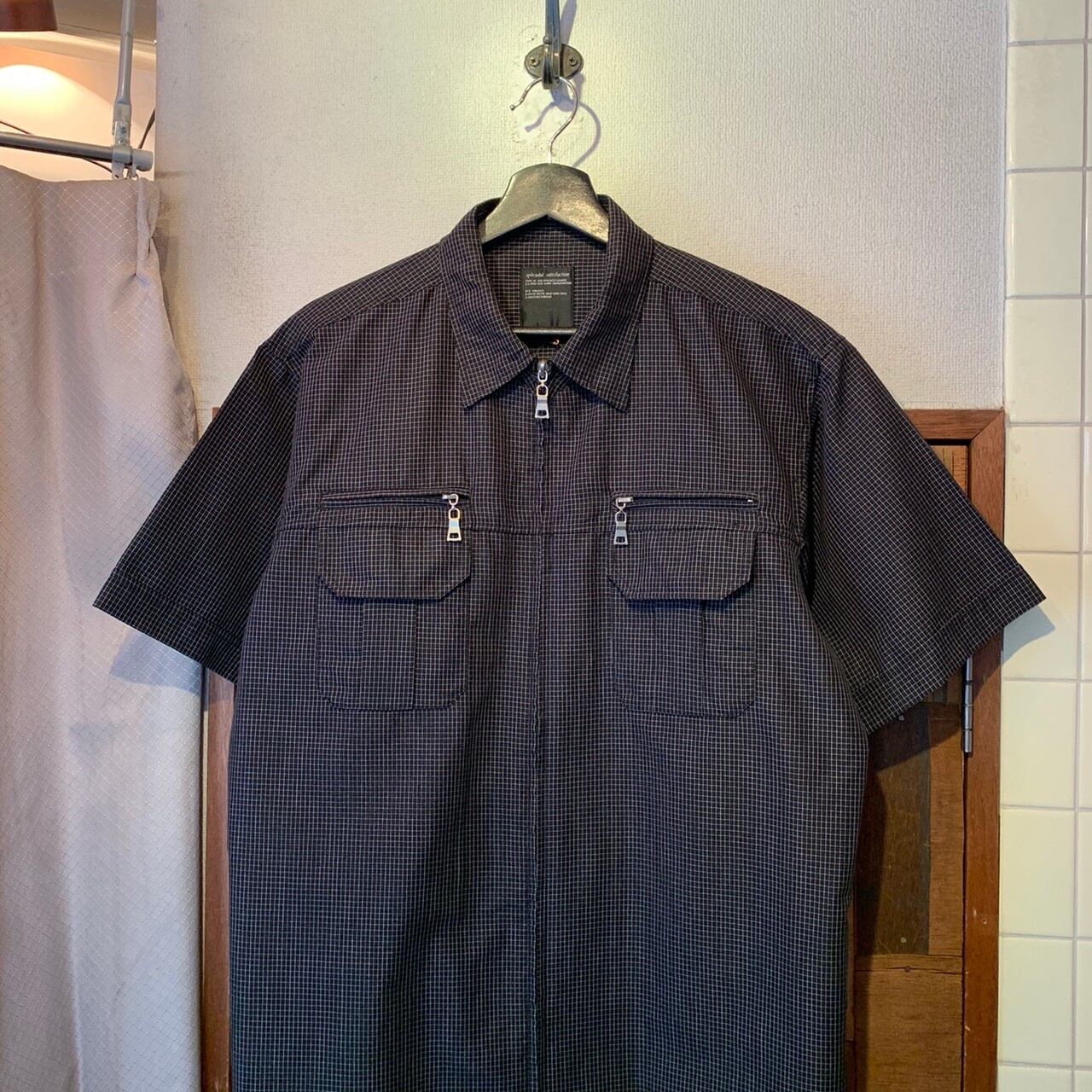 “Splendid satisfaction” black×white cotton/poly check pattern zip-up design S/S shirt