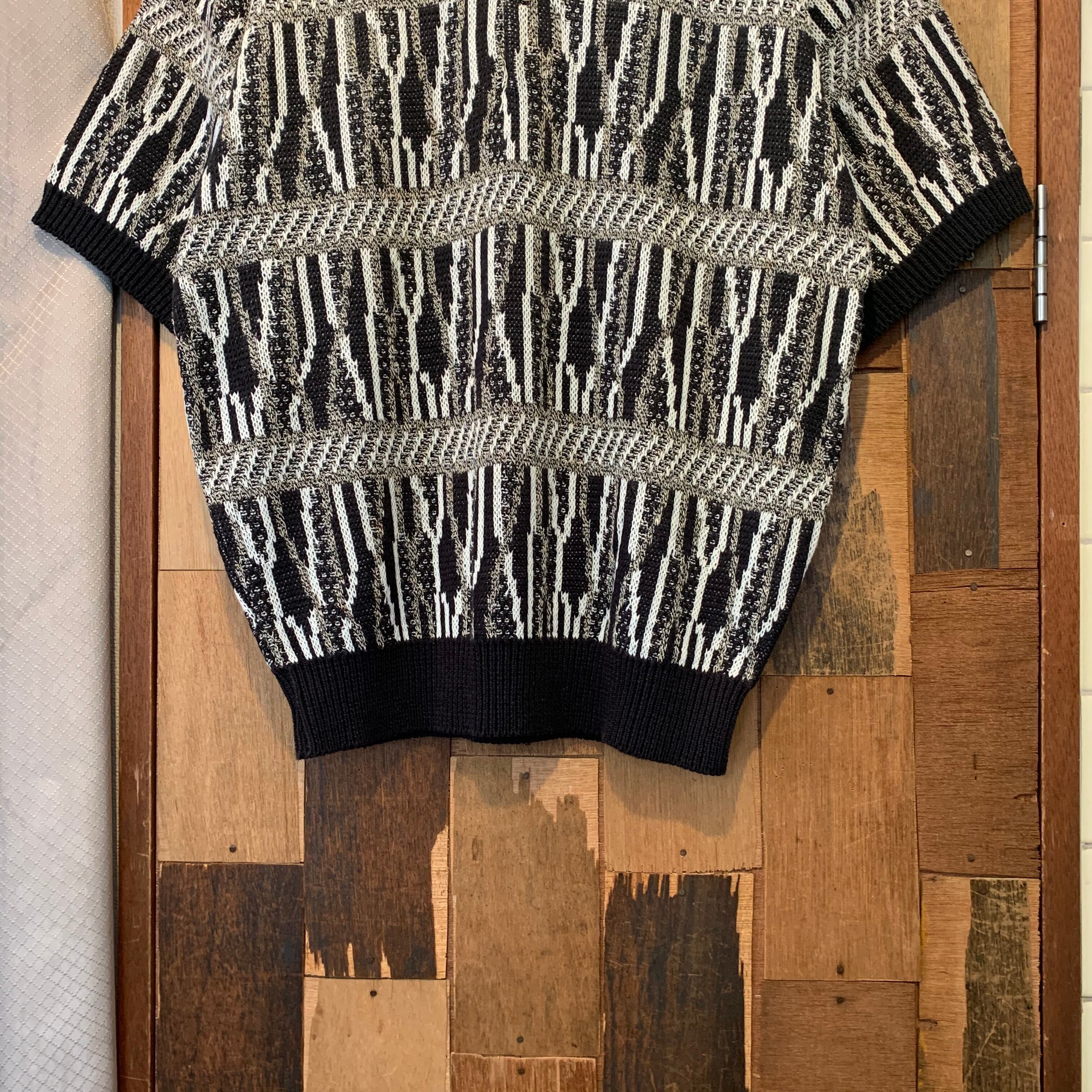 “SIMPLE LIFE” black base repeating pattern S/S knit polo shirt