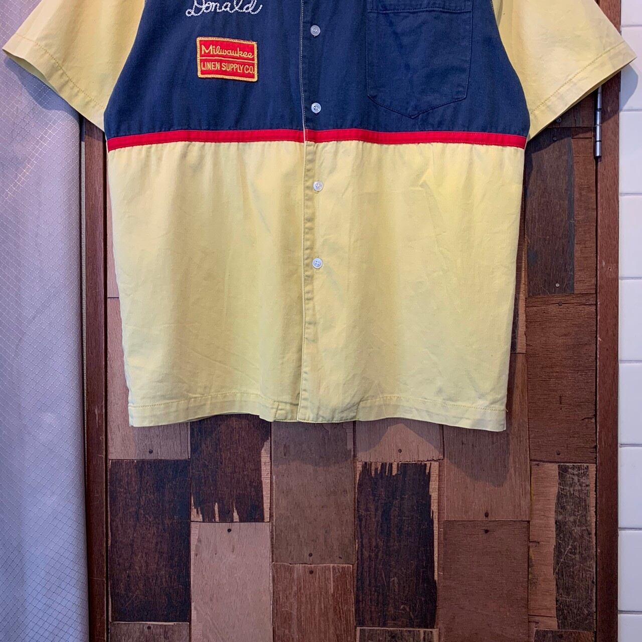 “H.S.T” lemon yellow base cotton wappen&embroidery design S/S open-collar shirt