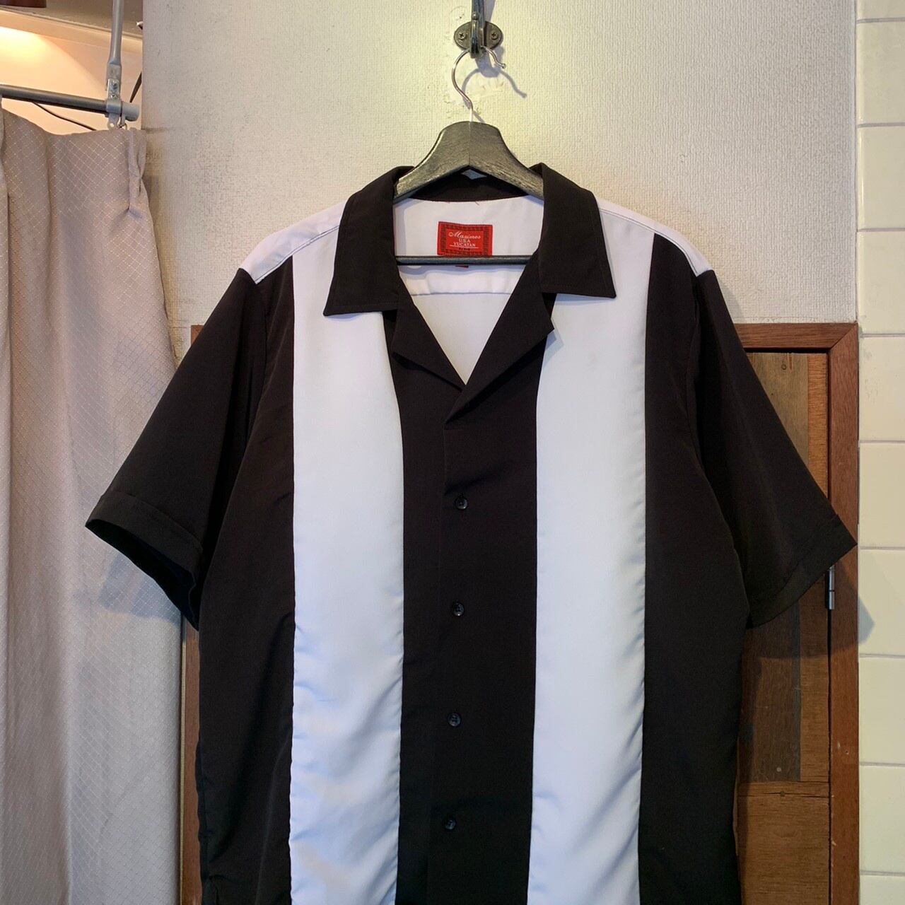 “Maximob” white×black polyester switch color design S/S open-collar shirt