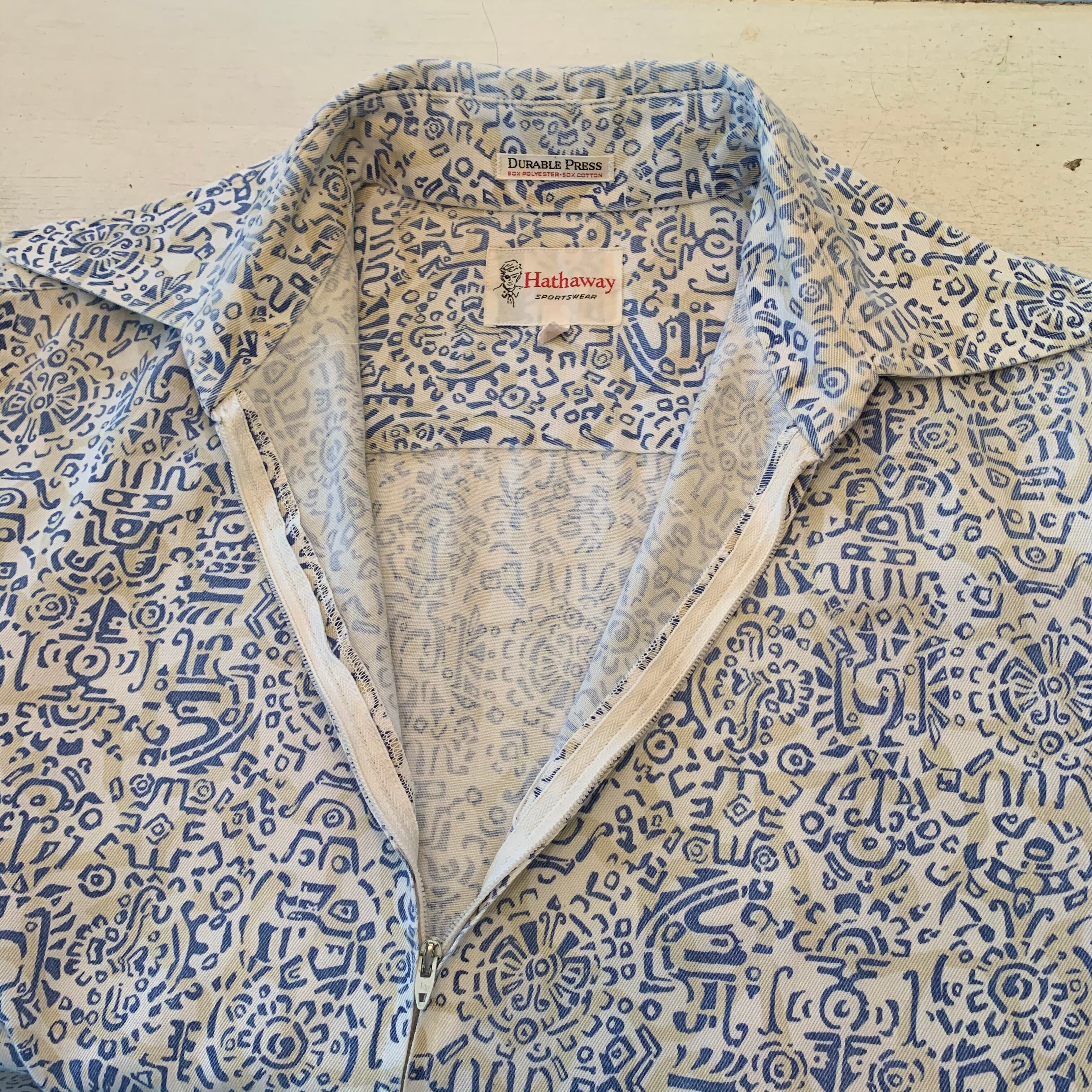 “Hathaway” 70’s~80’s white×blue repeating pattern S/S zip pullover shirt