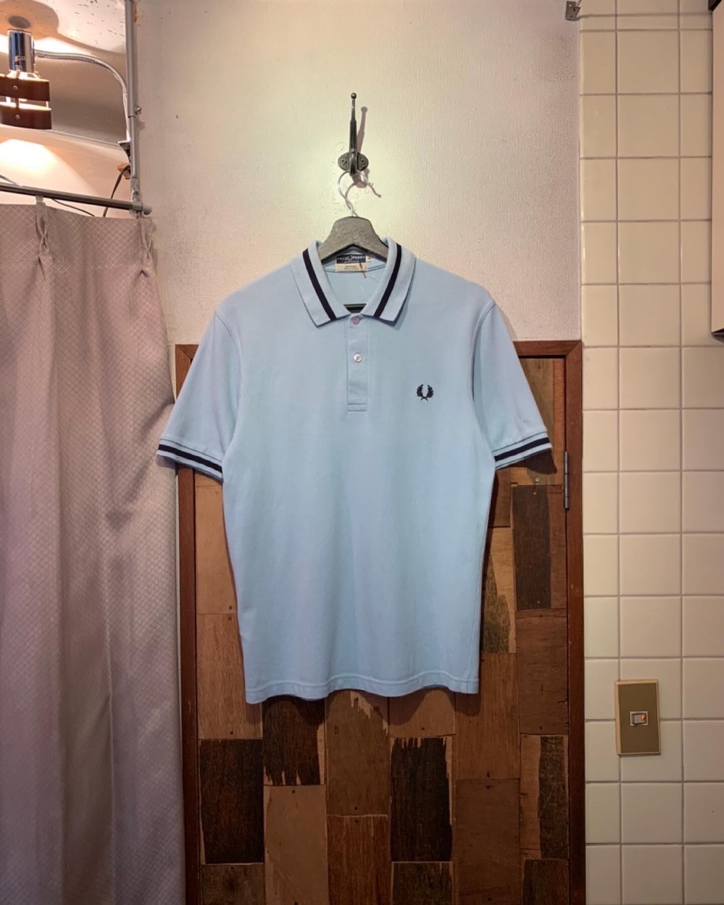 “FRED PERRY” made in ENGLAND light blue×dark navy cotton line design S/S polo shirt
