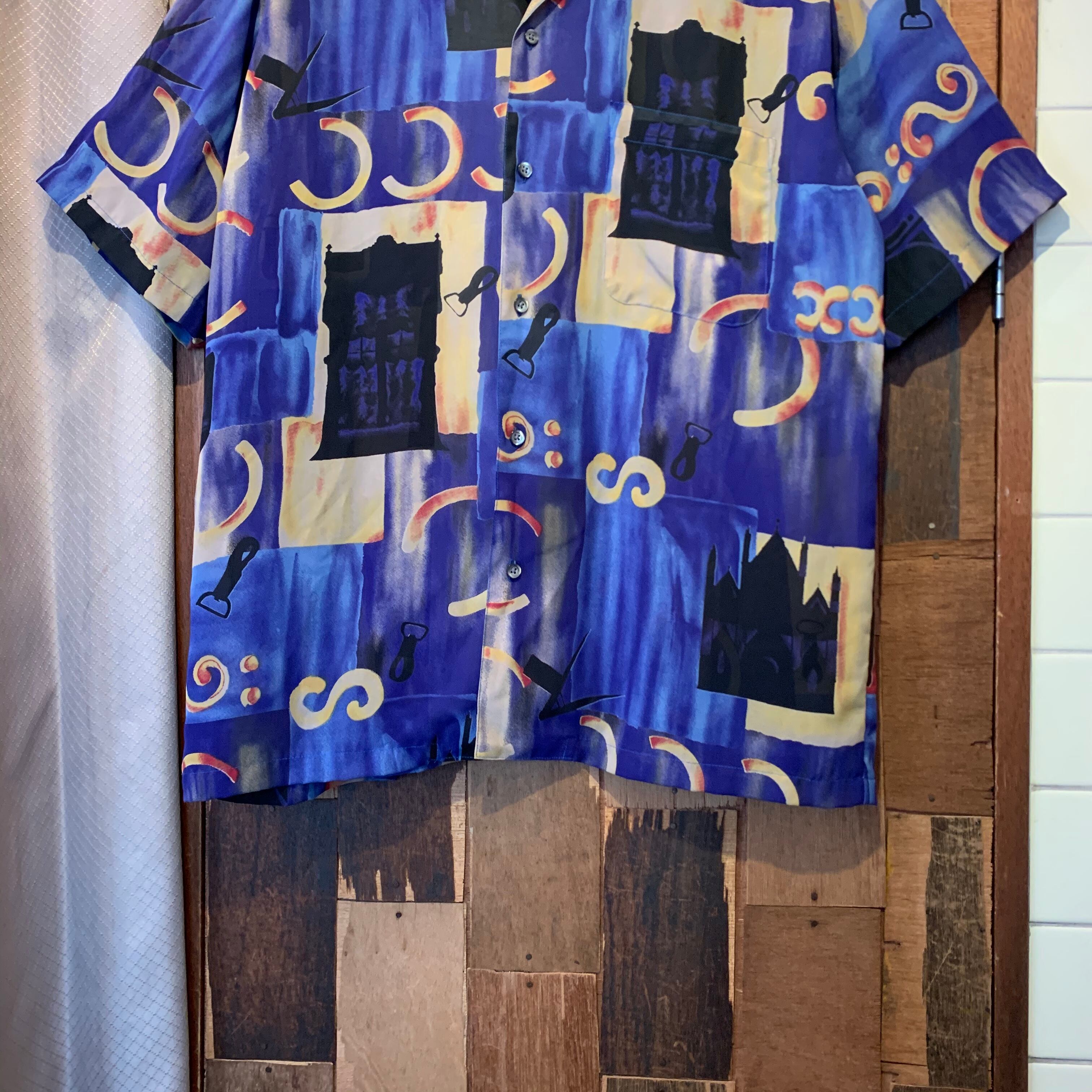 “Bras D’or” navy base unique pattern see-through design S/S open-collar shirt
