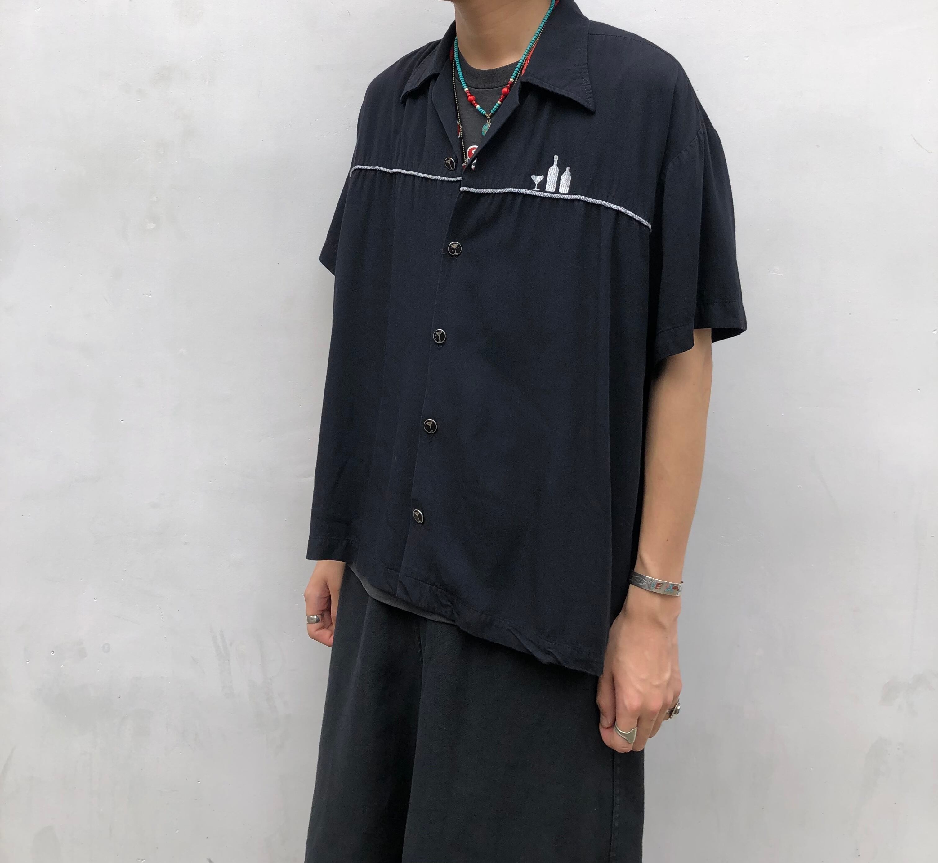 “SKYY” black rayon embroidery design S/S open-collar shirt