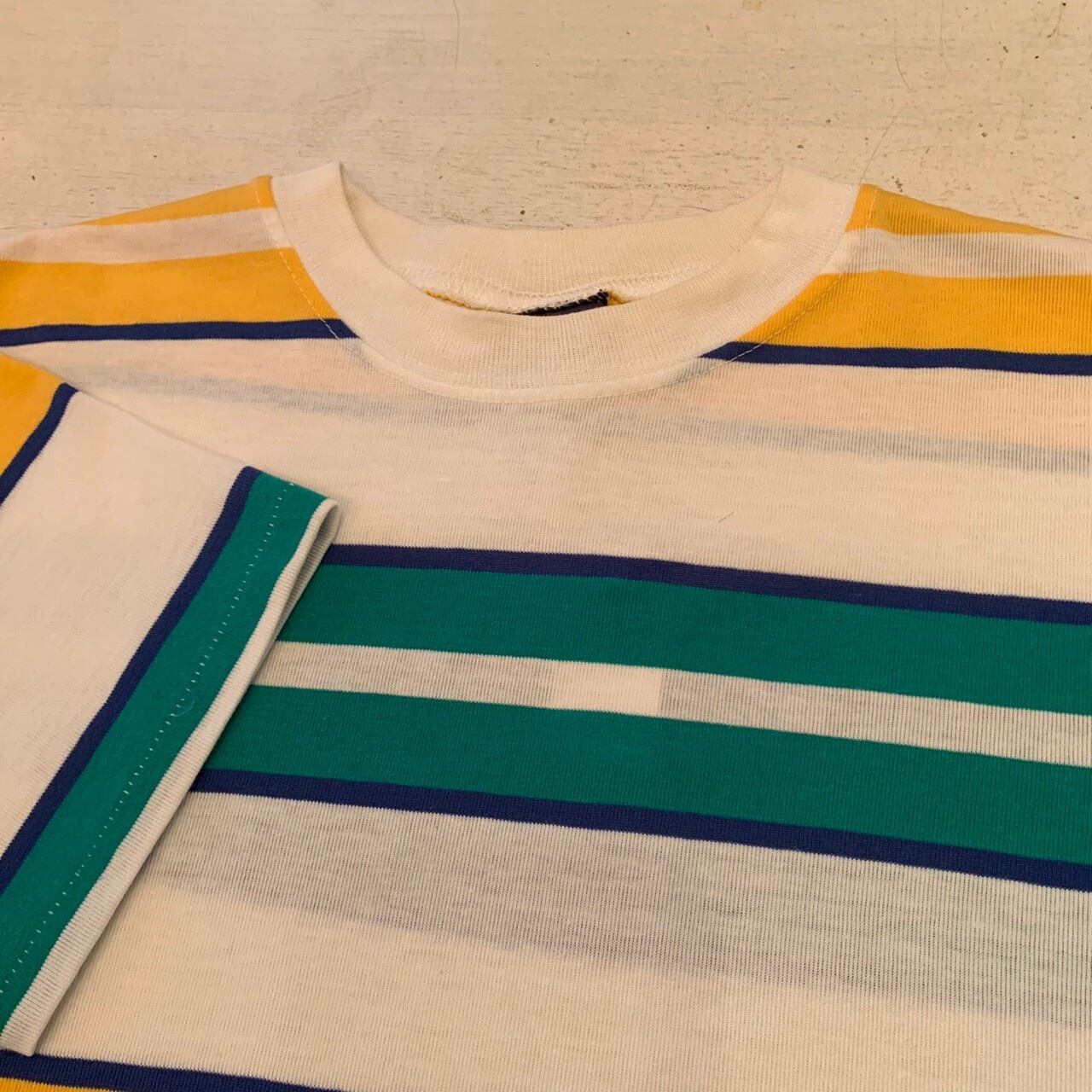 “HUNT CLUB” 90's made in U.S.A multi color cotton/poly border pattern S/S T-shirt
