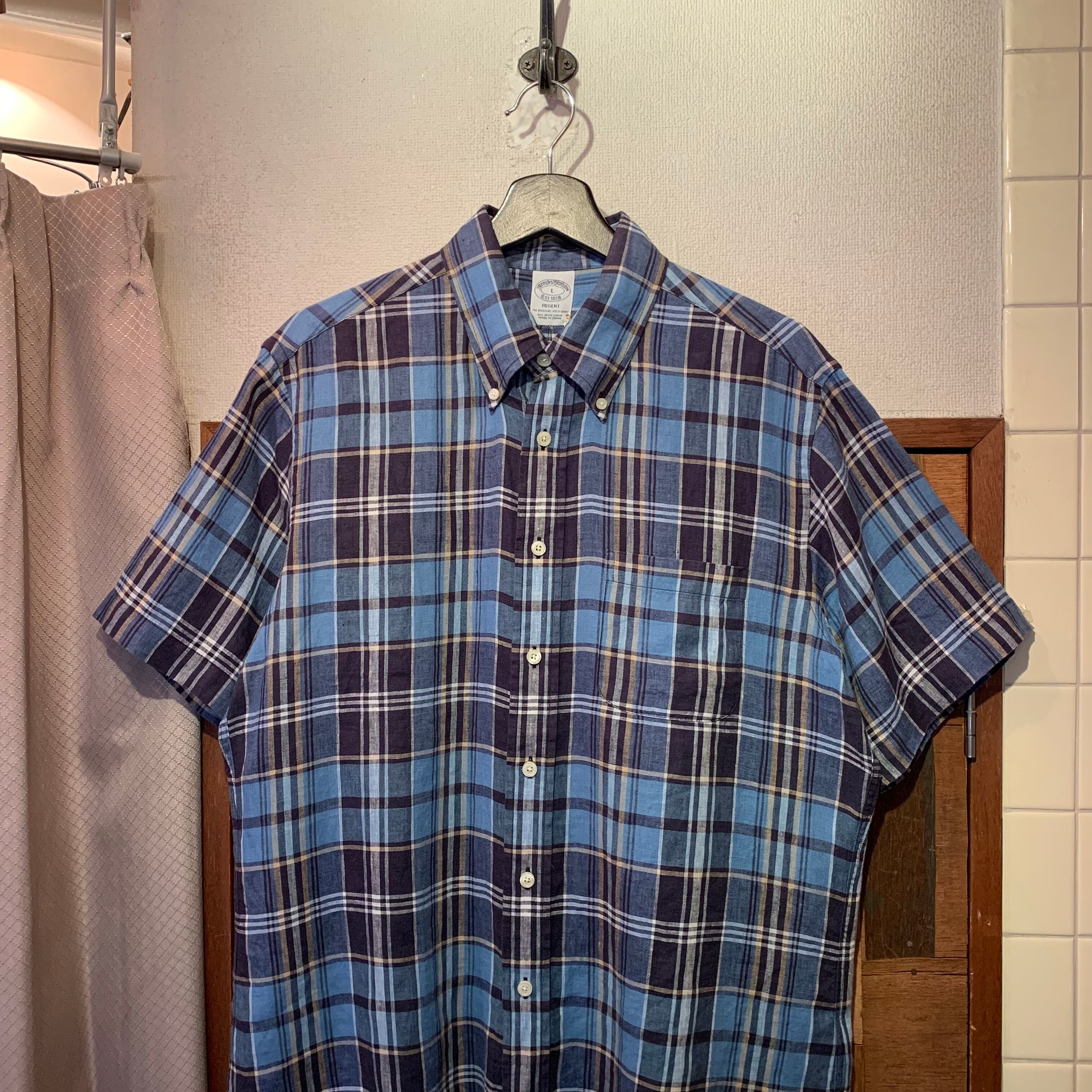 “Brooks Brothers” navy×blue linen check pattern S/S BD shirt