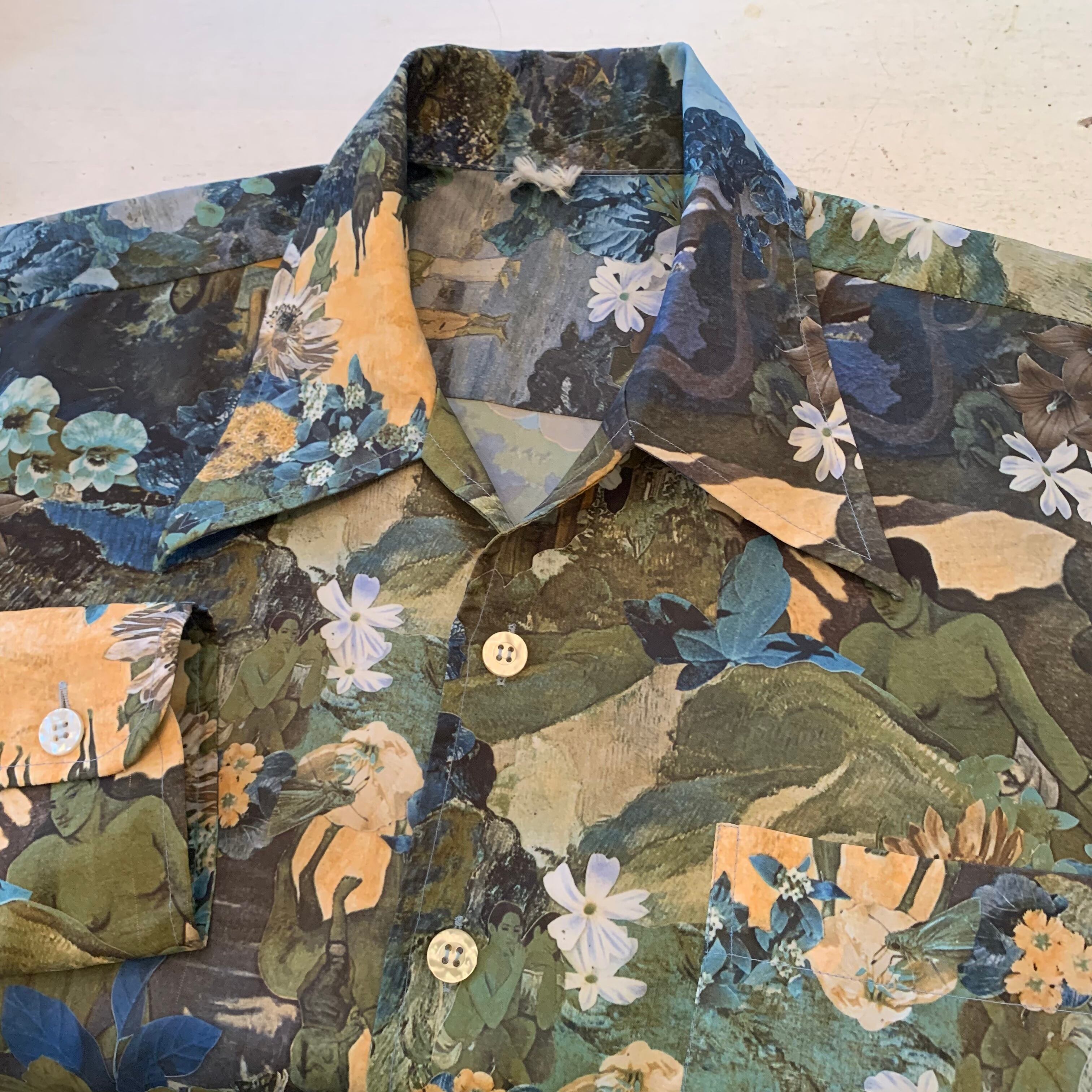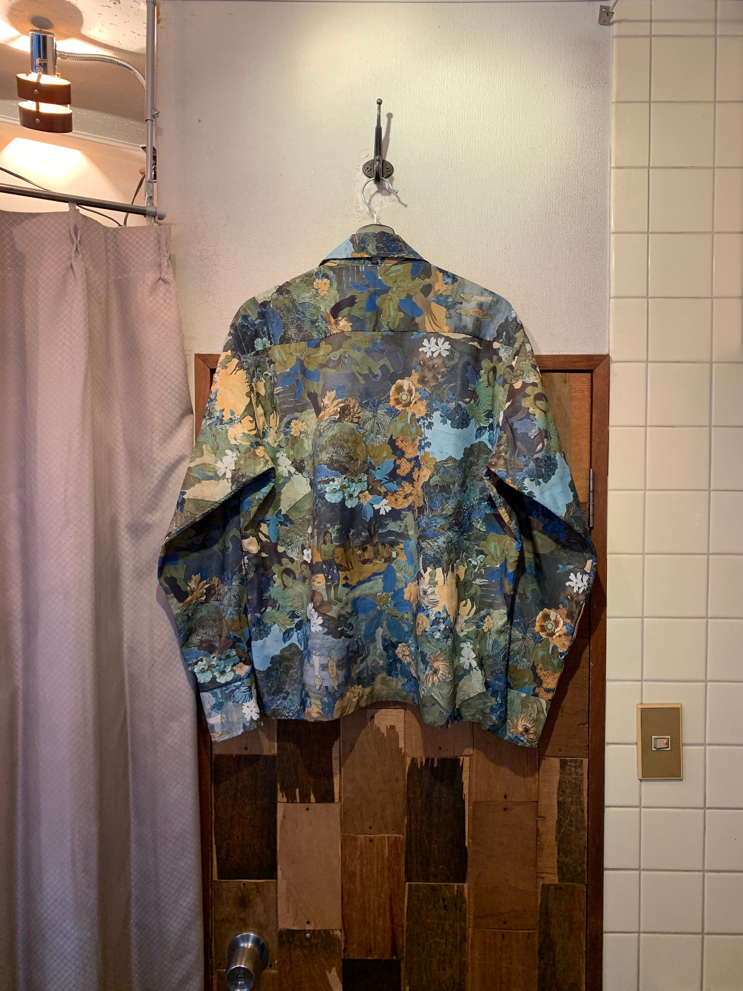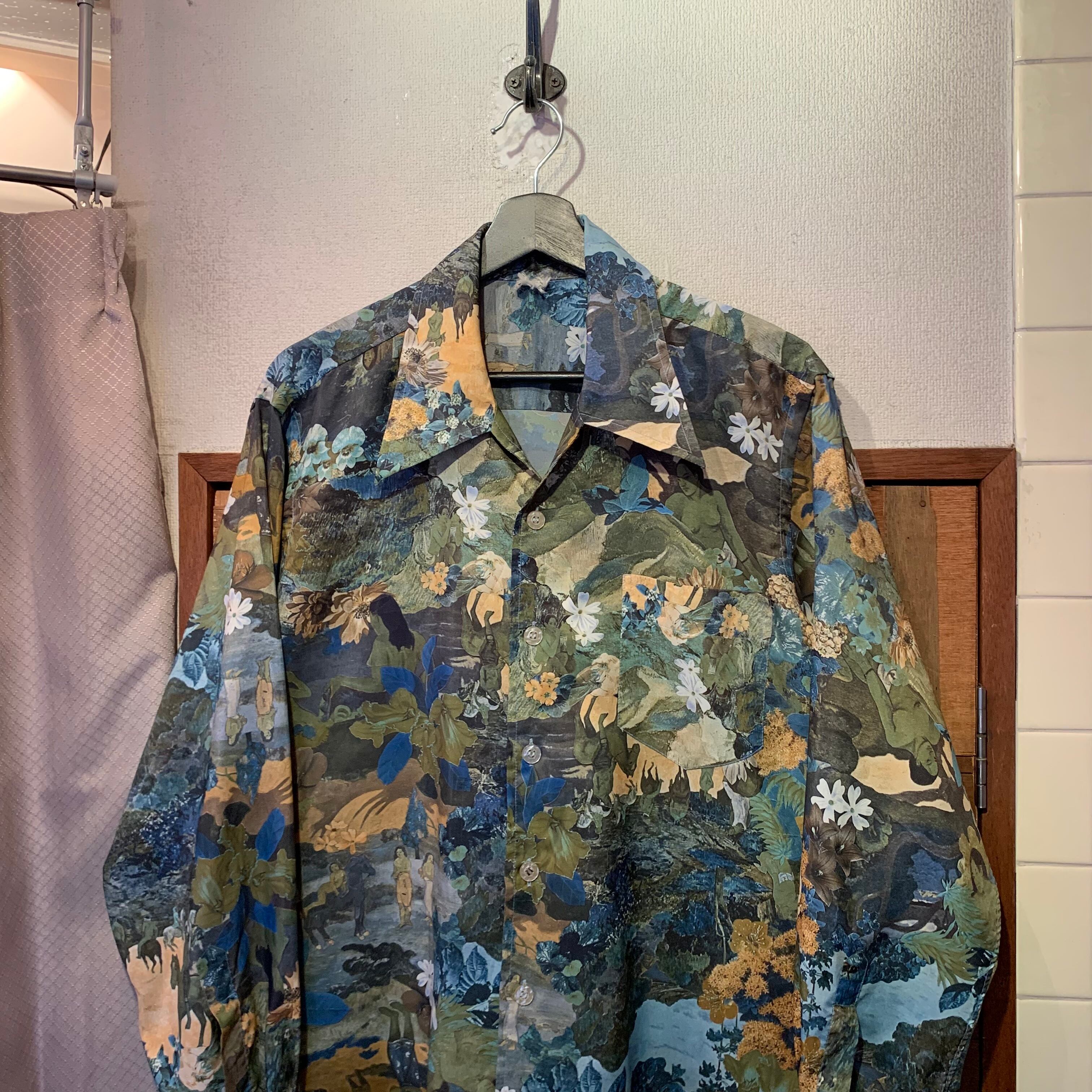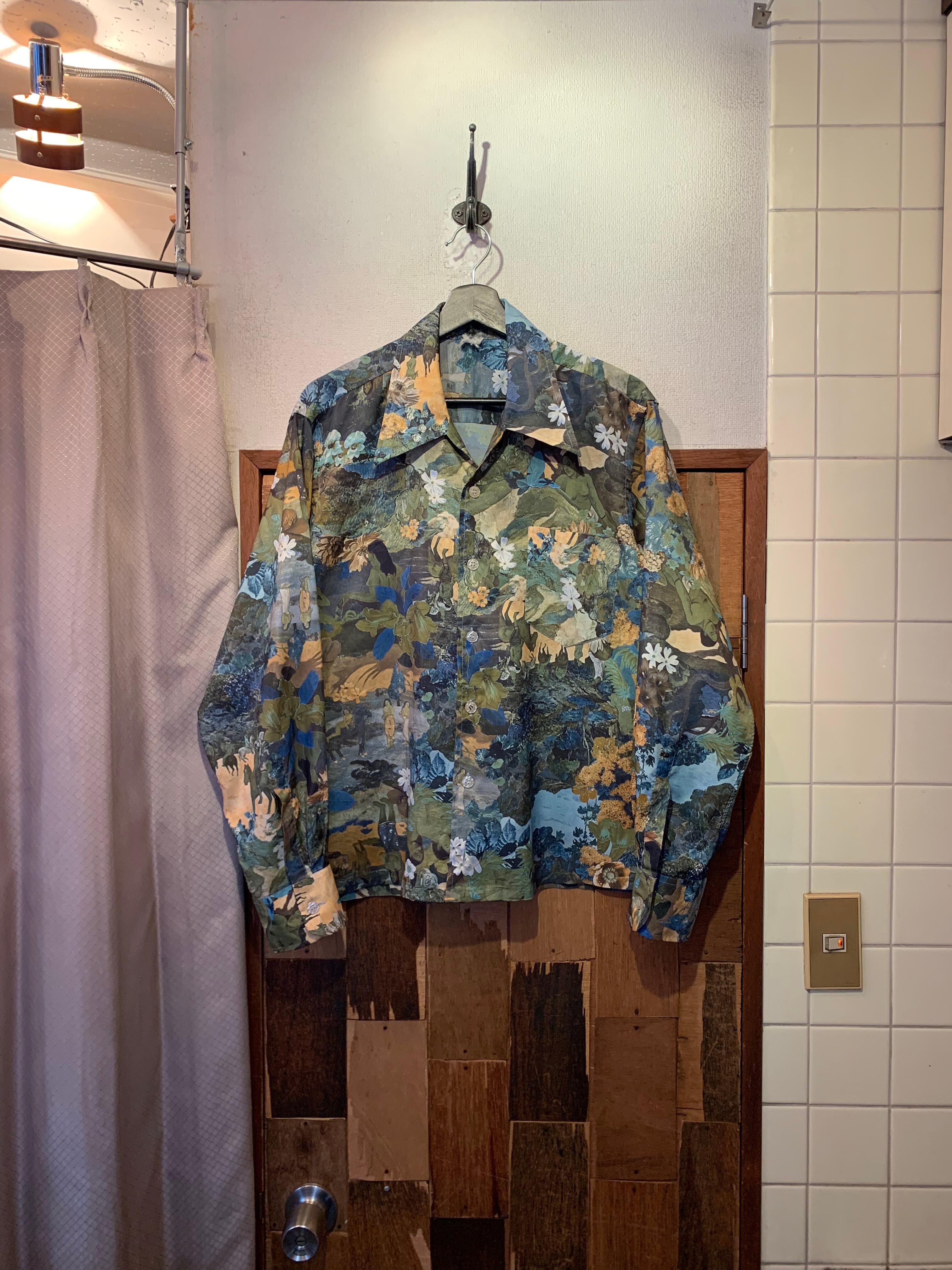 “brand unknown” 70’s vintage 画家「ポール・ゴーギャン」multi color art pattern L/S open-collar shirt