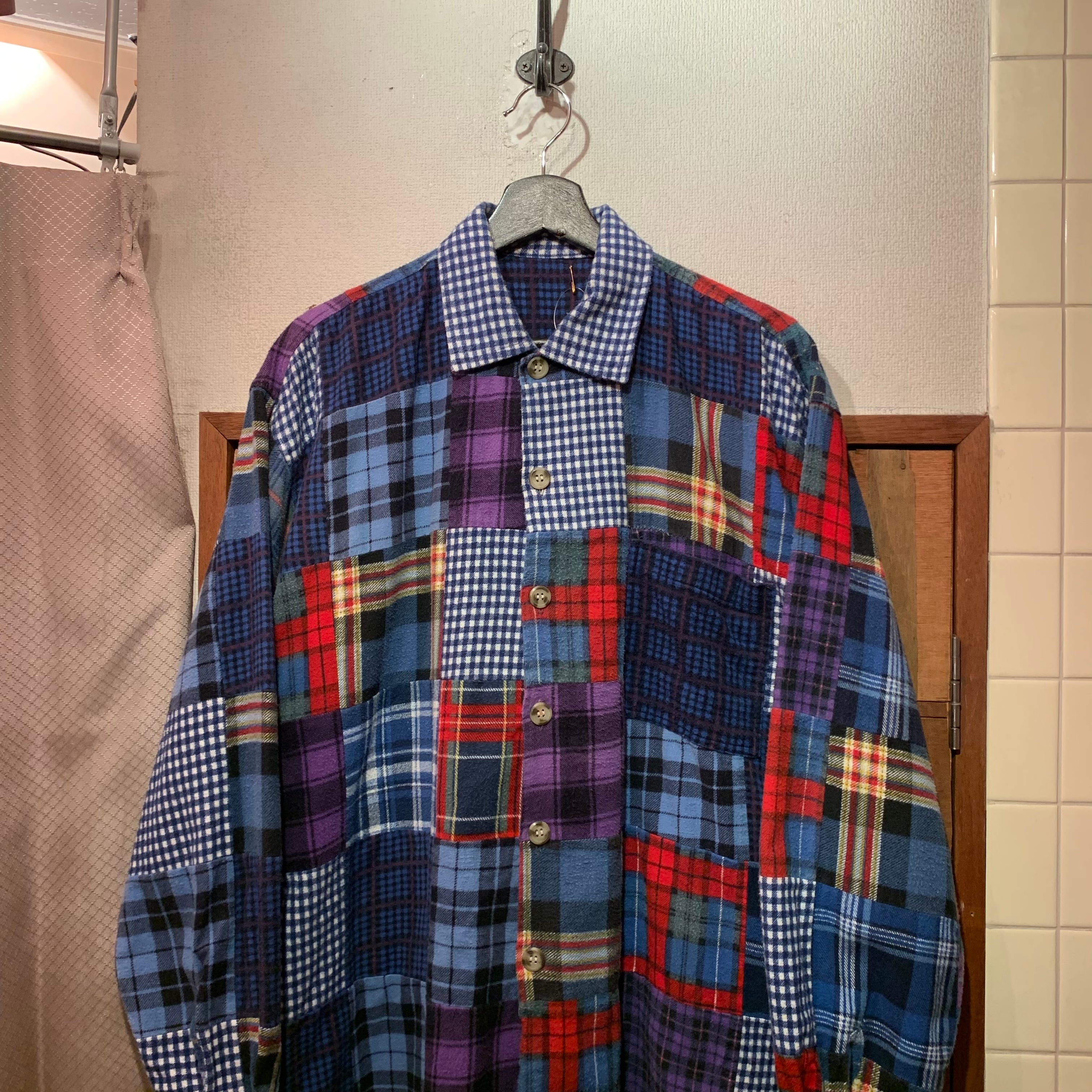“brand unknown” blue base multi color cotton patch work design L/S shirt