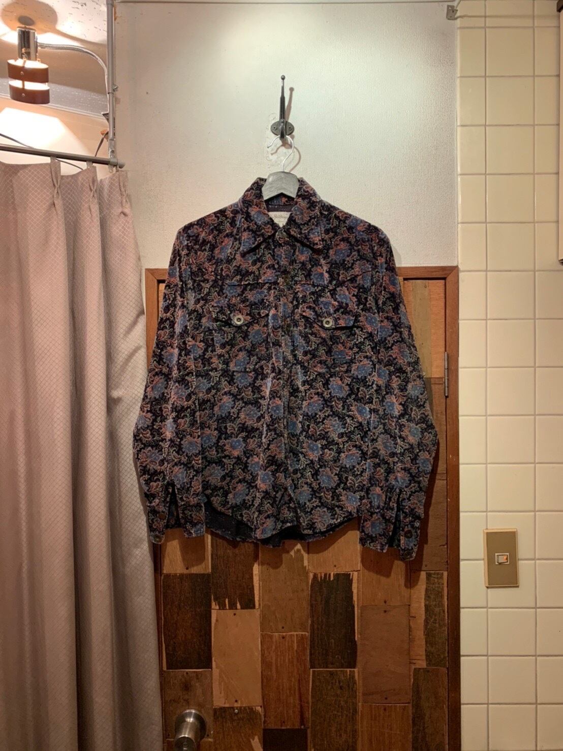 “shirt design tnc” 70's~80's black base cotton flower pattern L/S velor shirt