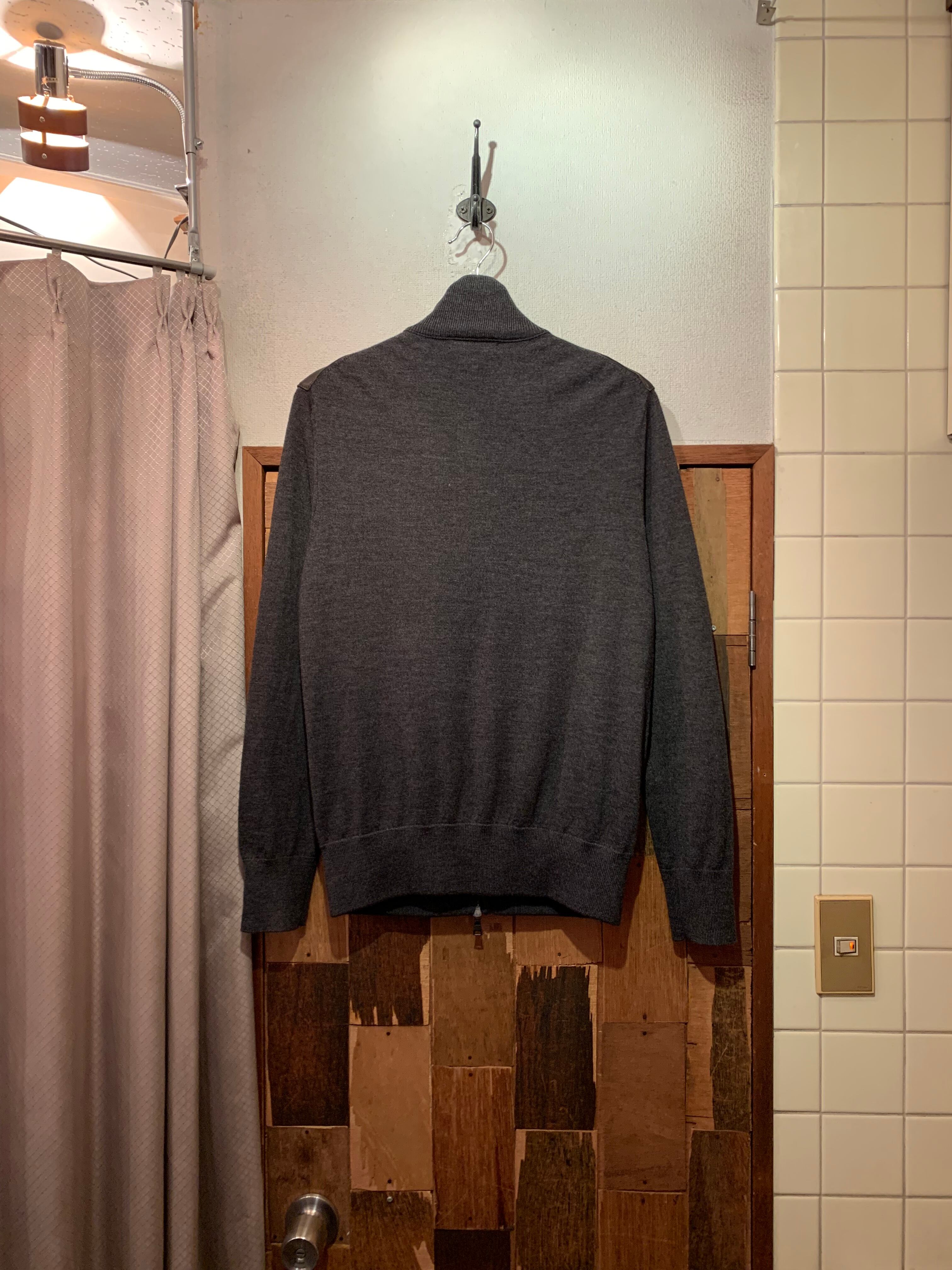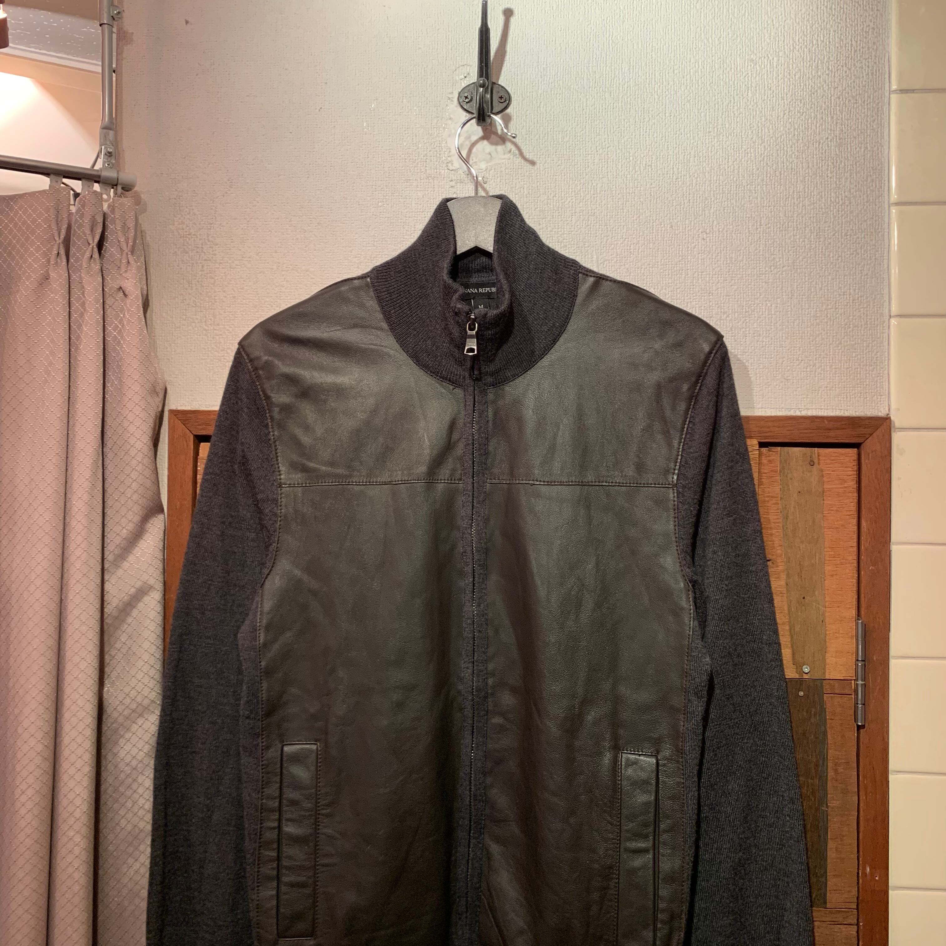 “BANANA REPUBLIC” dark gray wool/acrylic×sheep leather switch design zip-up knit jacket