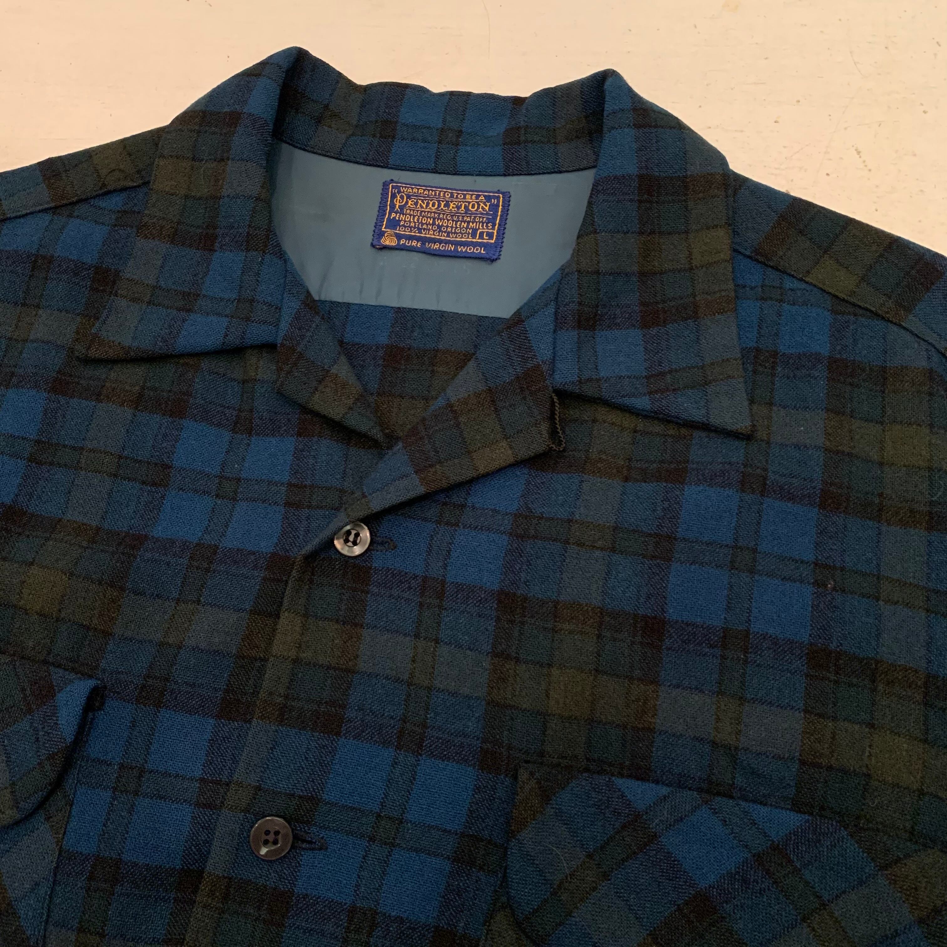 “PENDLETON” 60’s~ vintage blue base wool check pattern L/S open-collar shirt