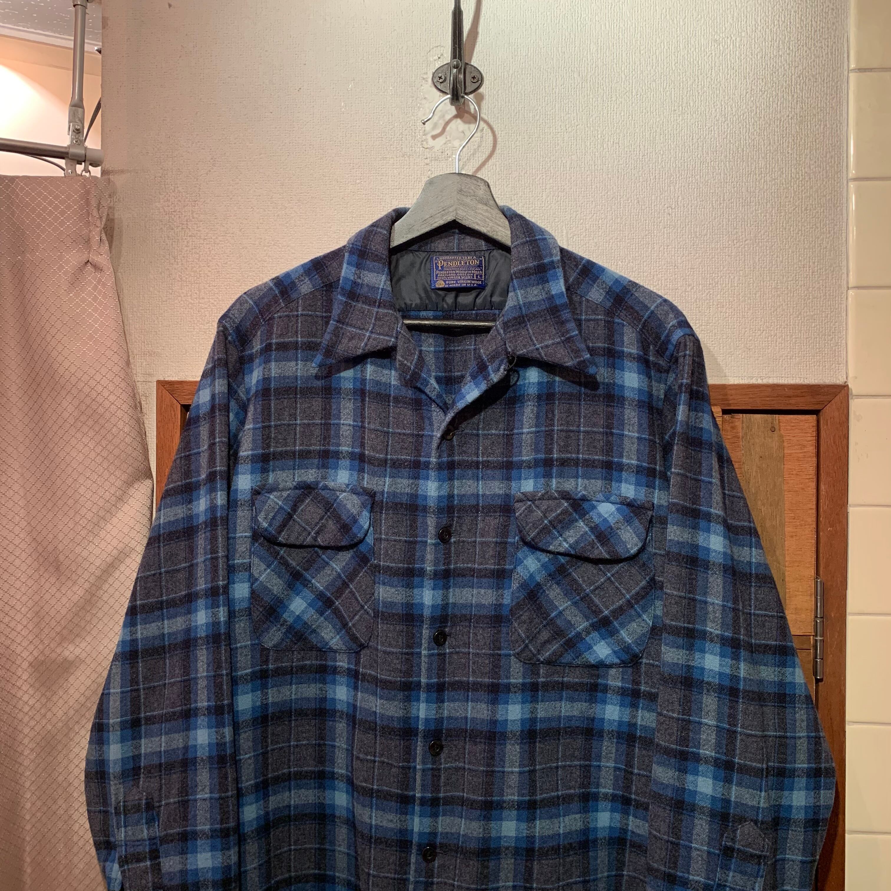 “PENDLETON” 70’s vintage blue×charcoal gray wool check pattern L/S open-collar shirt