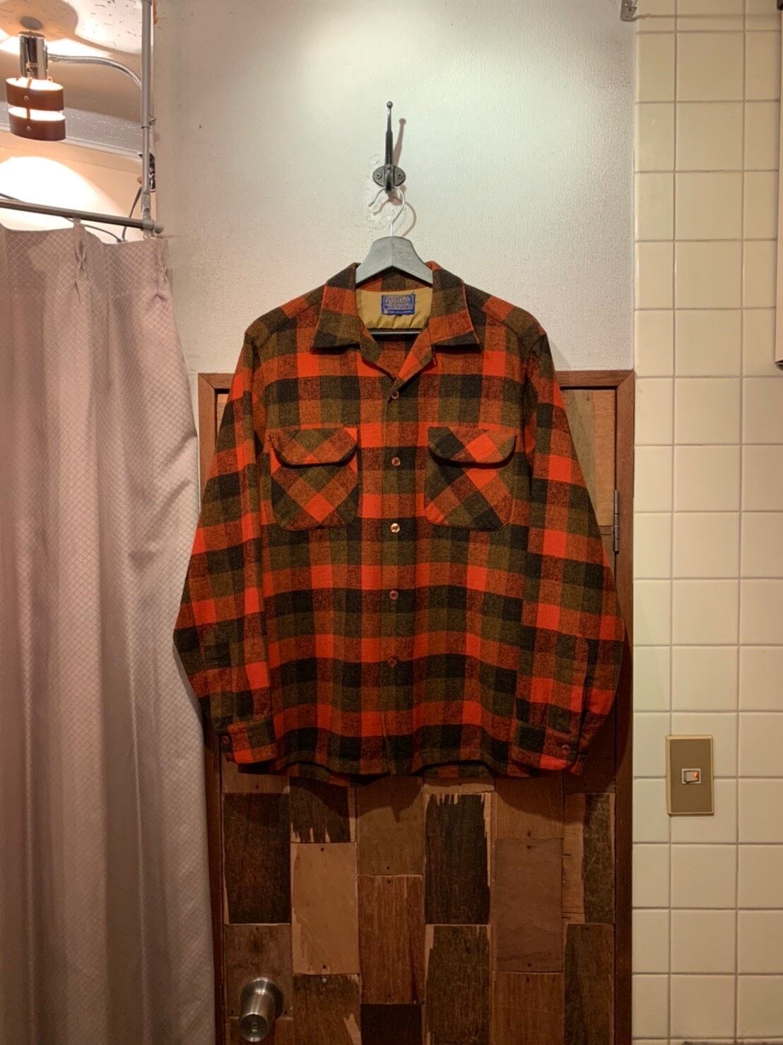 “PENDLETON” 60's~vintage red×black base wool check pattern L/S open collar shirt