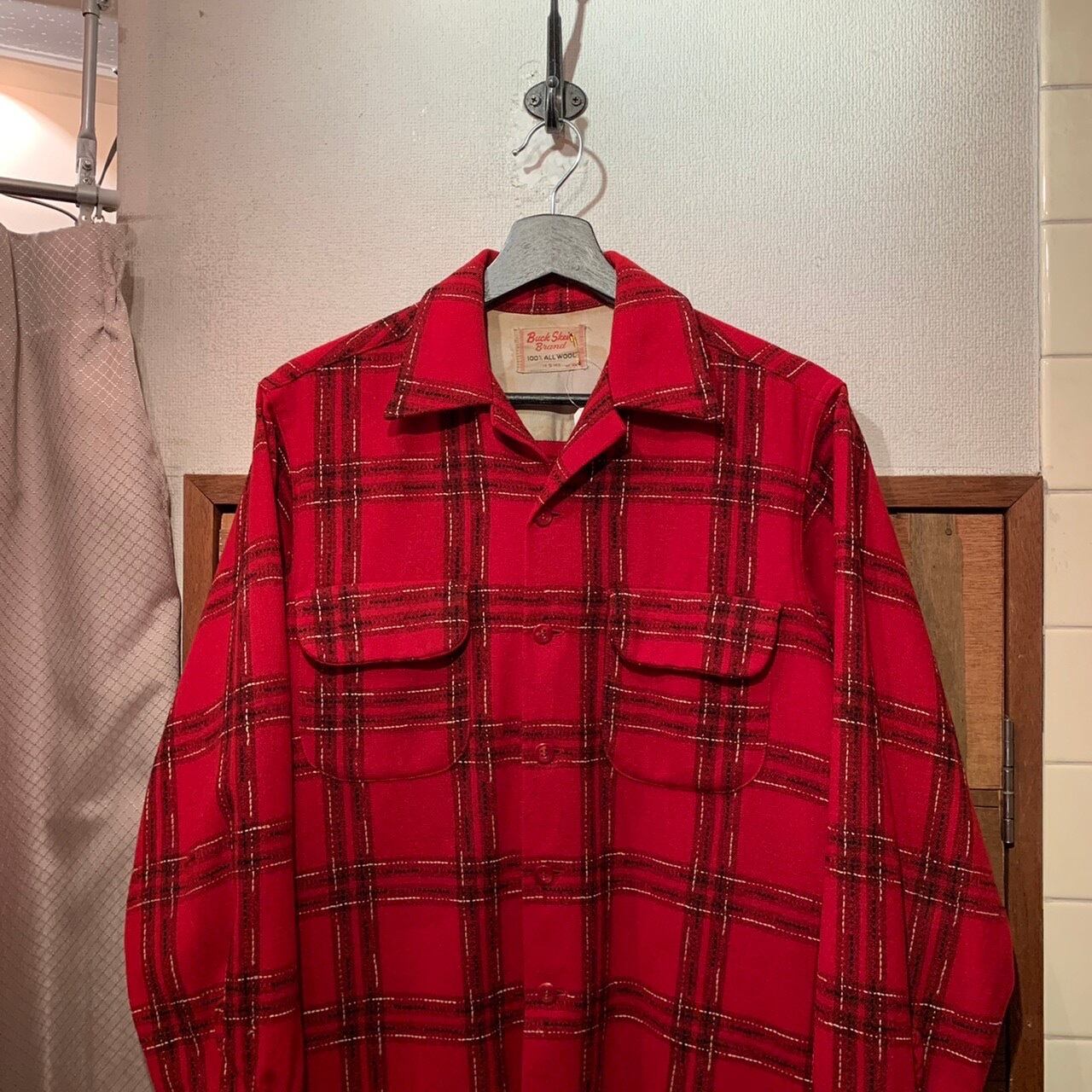 “Buck Skein Brand” 50's~vintage red×black×white wool unique check pattern L/S open collar shirt