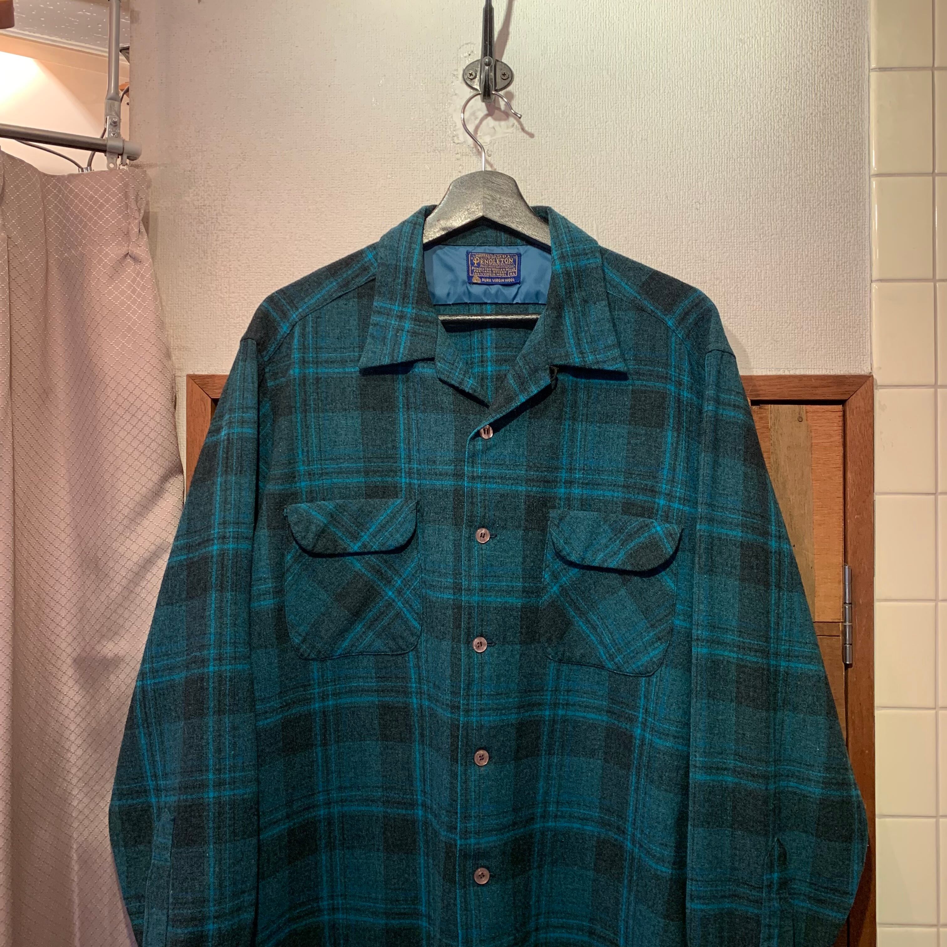 “PENDLETON” ~60's vintage turquoise blue base wool check pattern L/S open-collar shirt