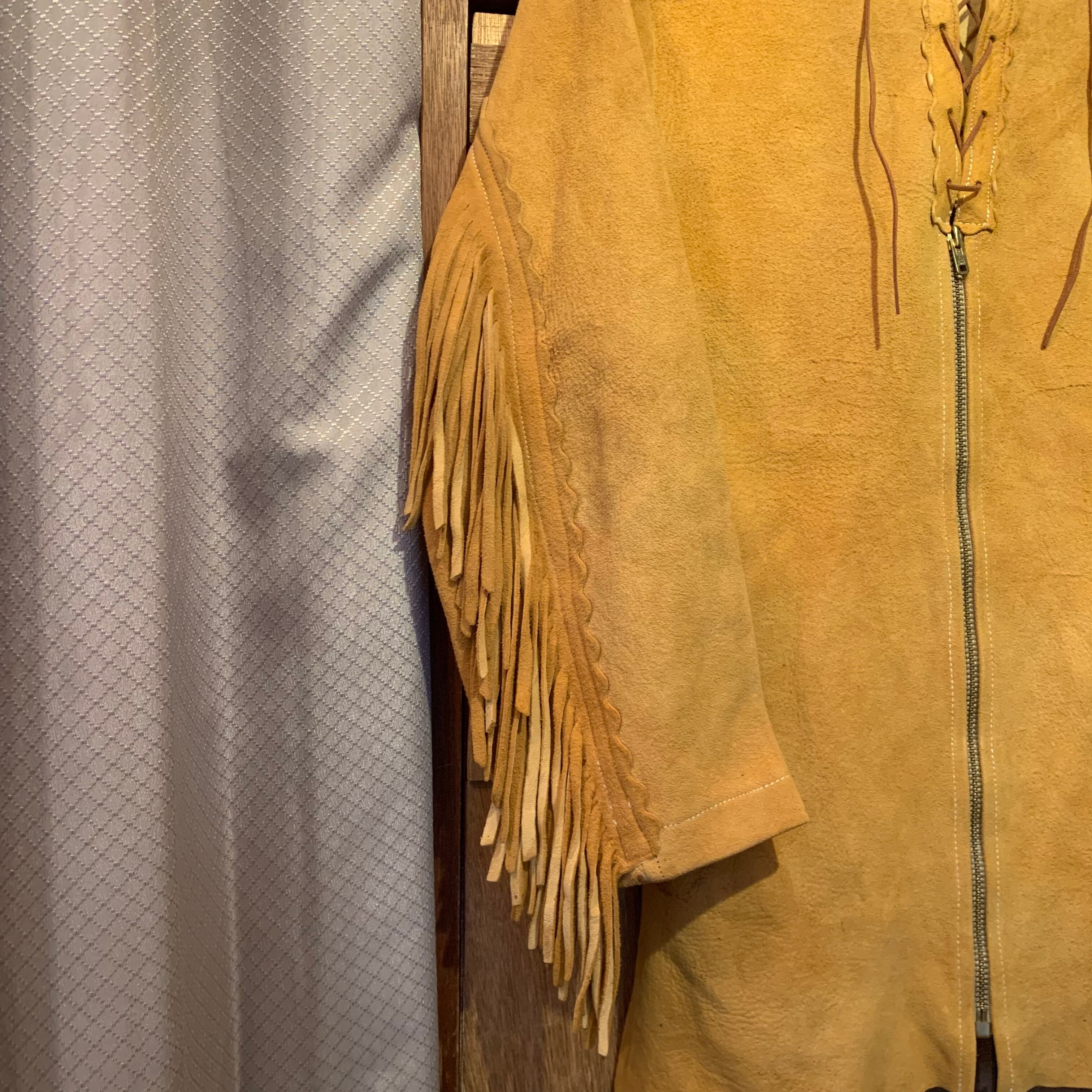 “brand unknown” 60’s~70’s vintage light brown nubuck lace-up&zip-up fringe jacket