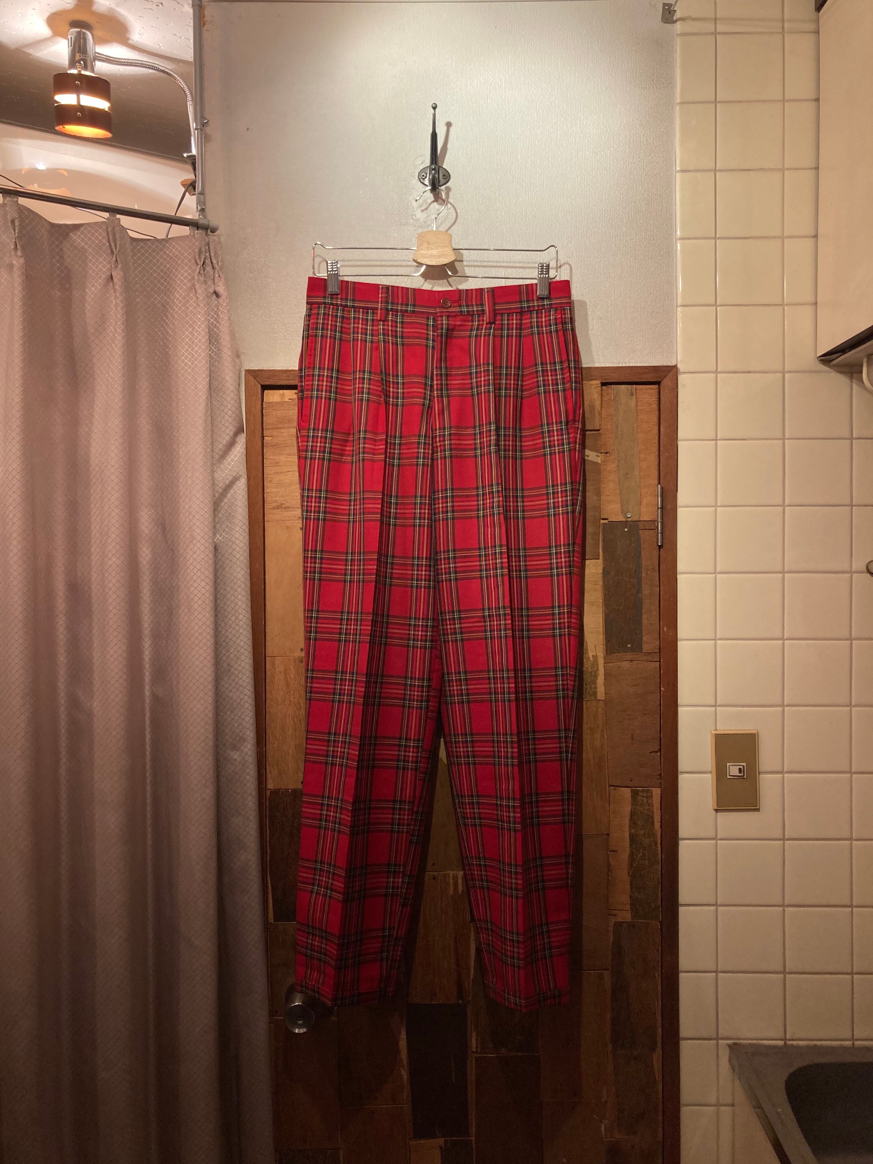 “brand unknown” red poly/wool check pattern 2tuck slacks