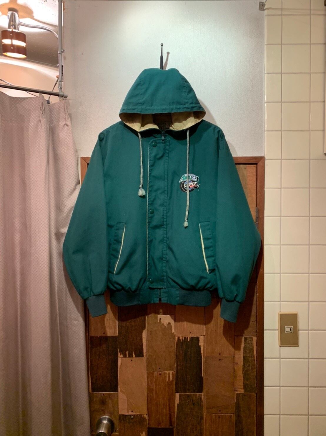 “PRO FIT” 80's~90's made in U.S.A 「HOUSTON AEROS」green poly/cotton point logo design zip-up hooded blouson