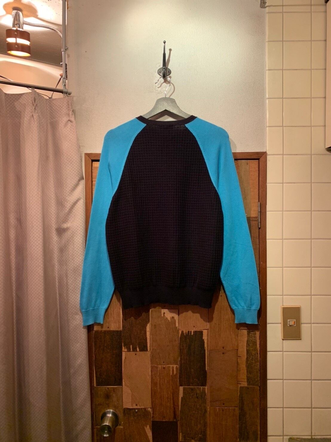 “byblos” made in ITALY light blue×black cotton unique zip pattern knit sweater