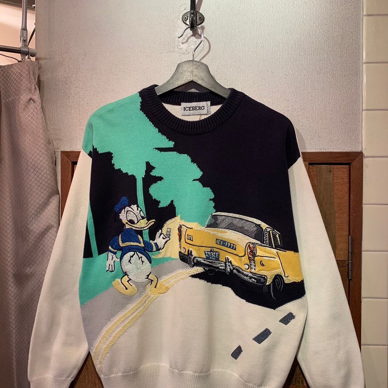 “ICEBERG” 「ドナルド・ダック」made in ITALY white×green×black cotton unique character pattern knit sweater