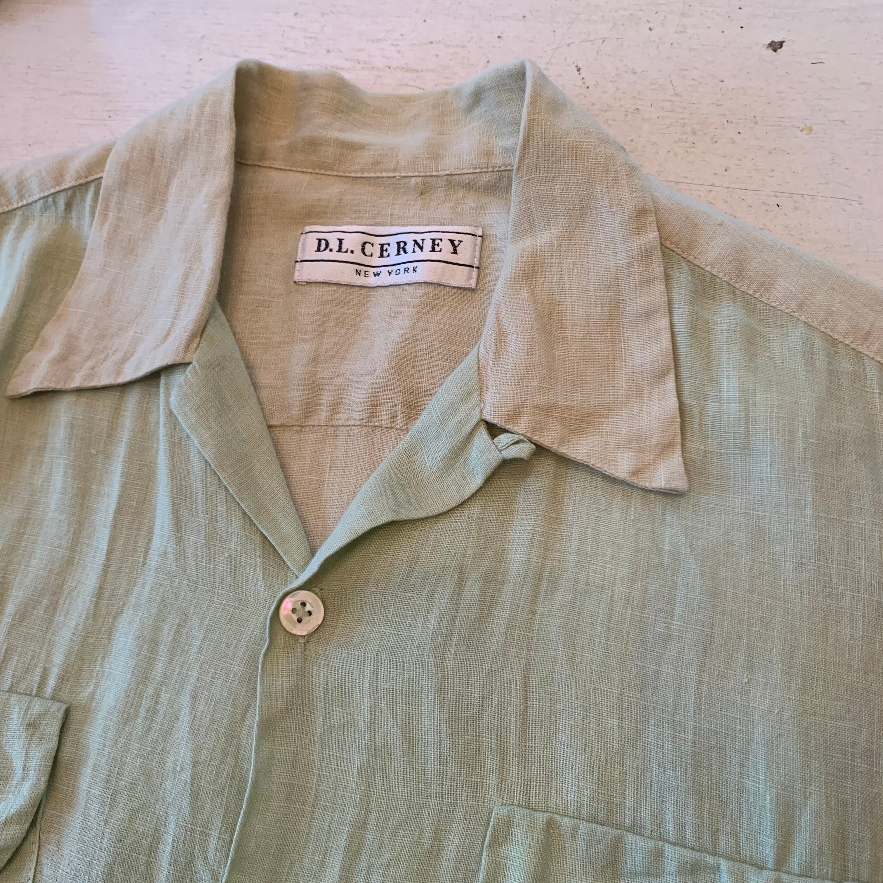 “D.L.CERNEY” pistachio×ivory linen L/S open-collar shirt made in USA