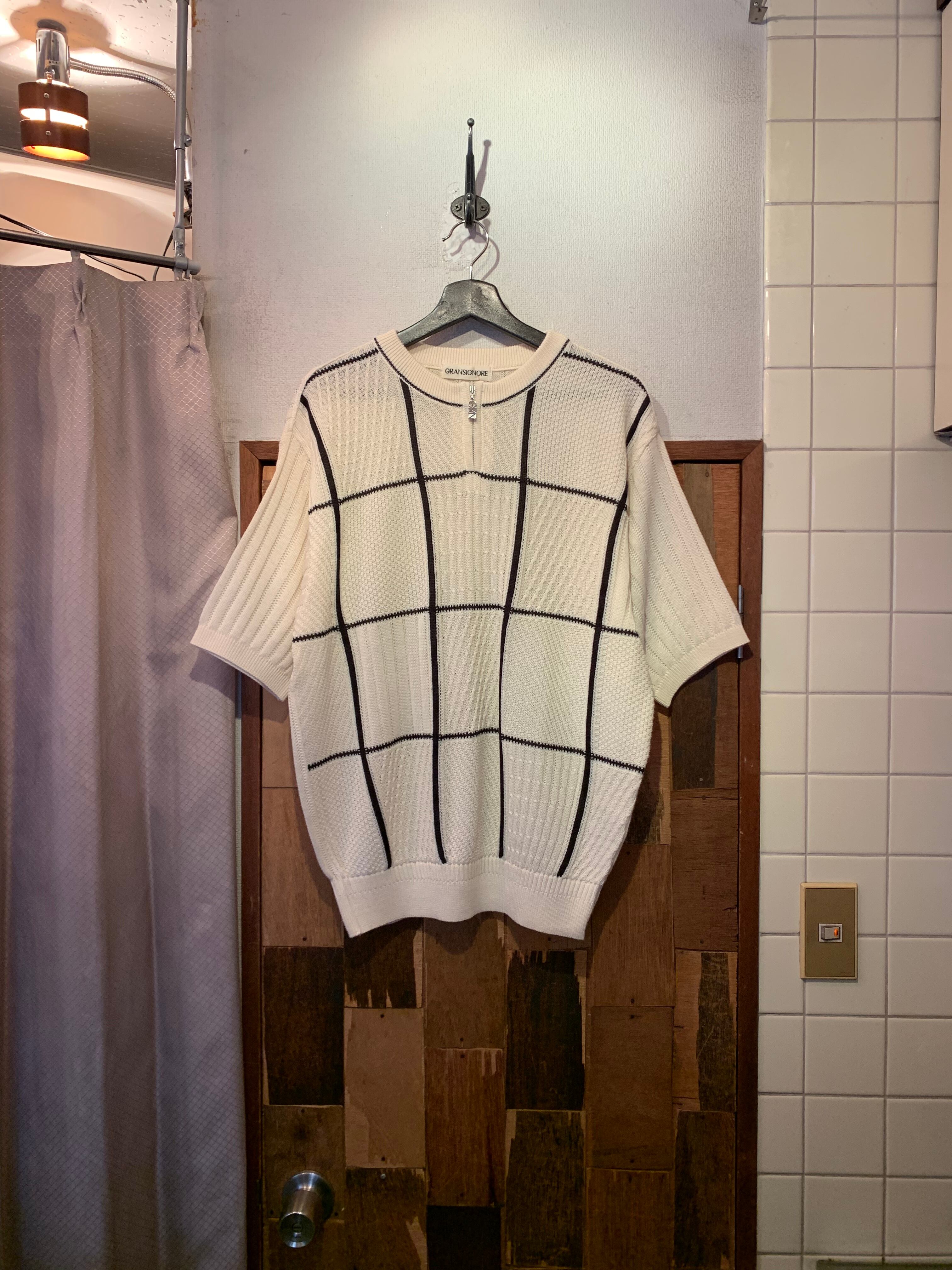 “GRANISIGNORE” ivory×black linen/acrylic half-zip design S/S knit