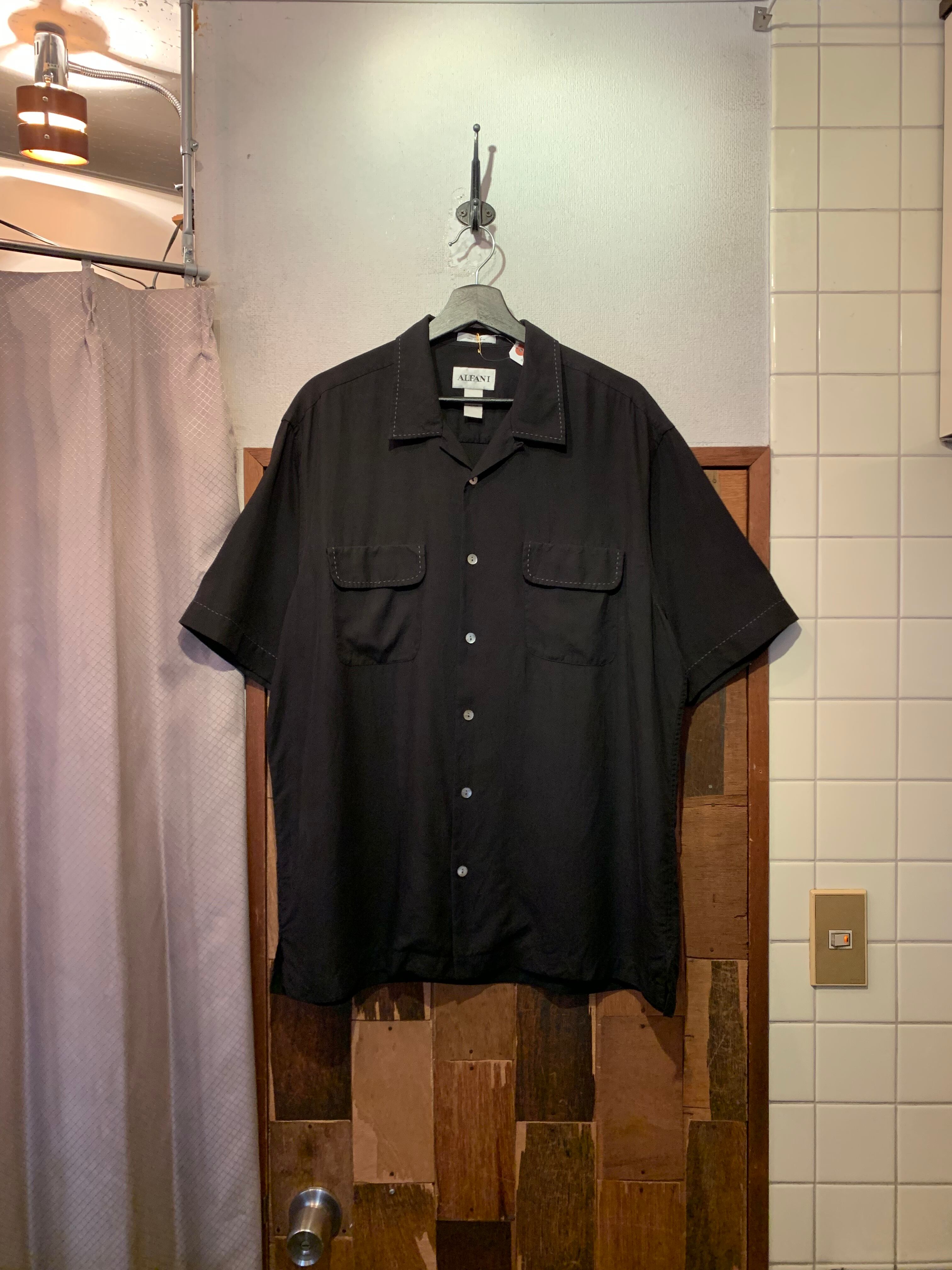 “ALFANI” black silk stitch design S/S open-collar shirt