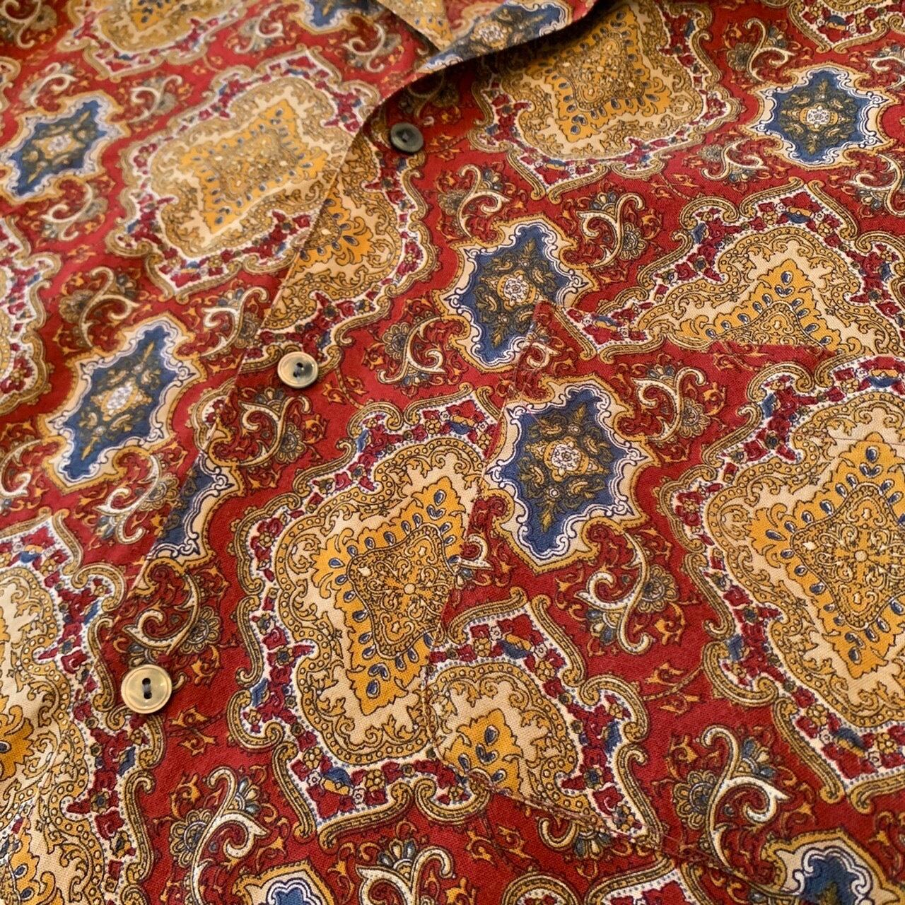 “CLUB 45” red×yellow base repeating pattern S/S open-collar shirt
