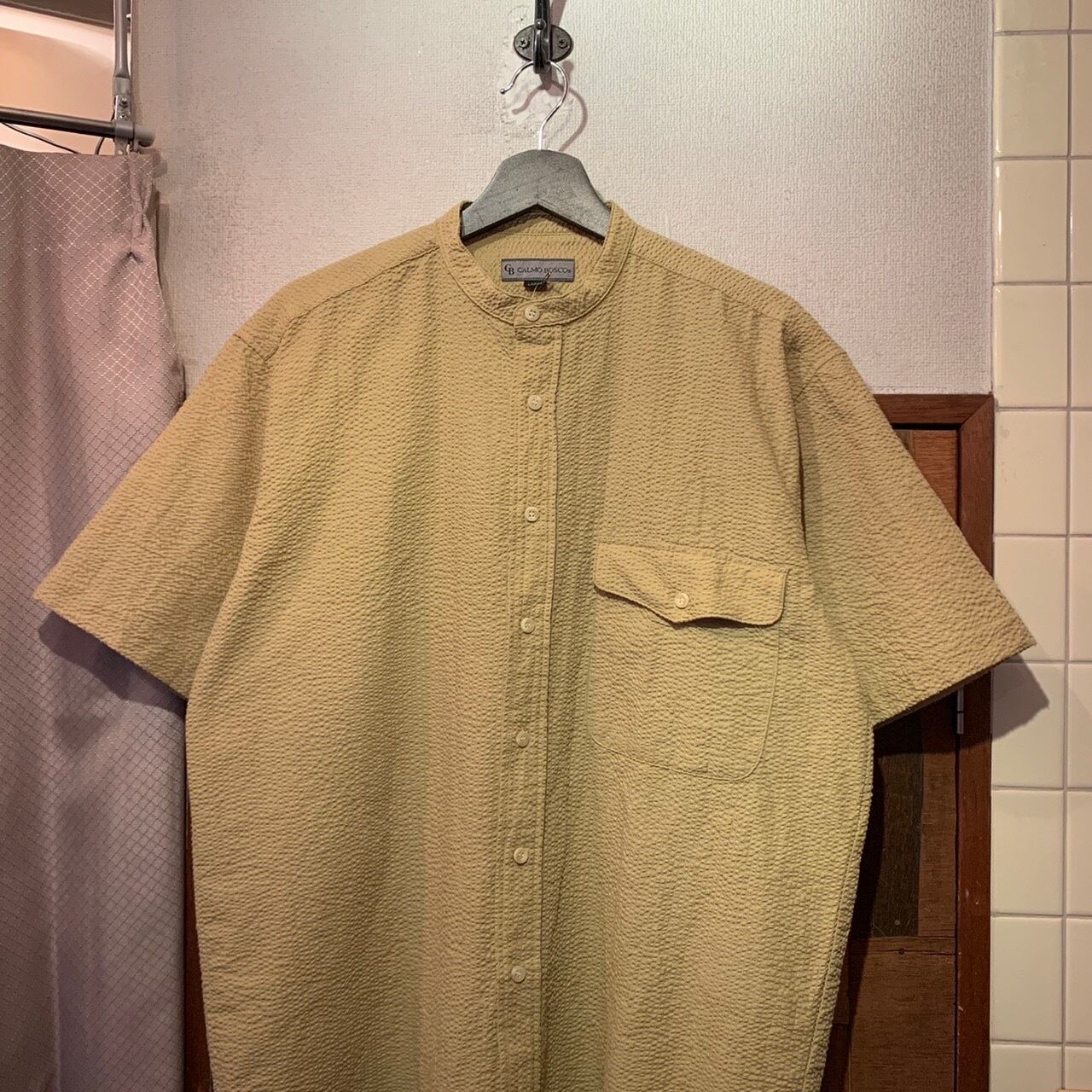 “CALMO BOSCO” Ocher polyester seersucker S/S band-collar shirt