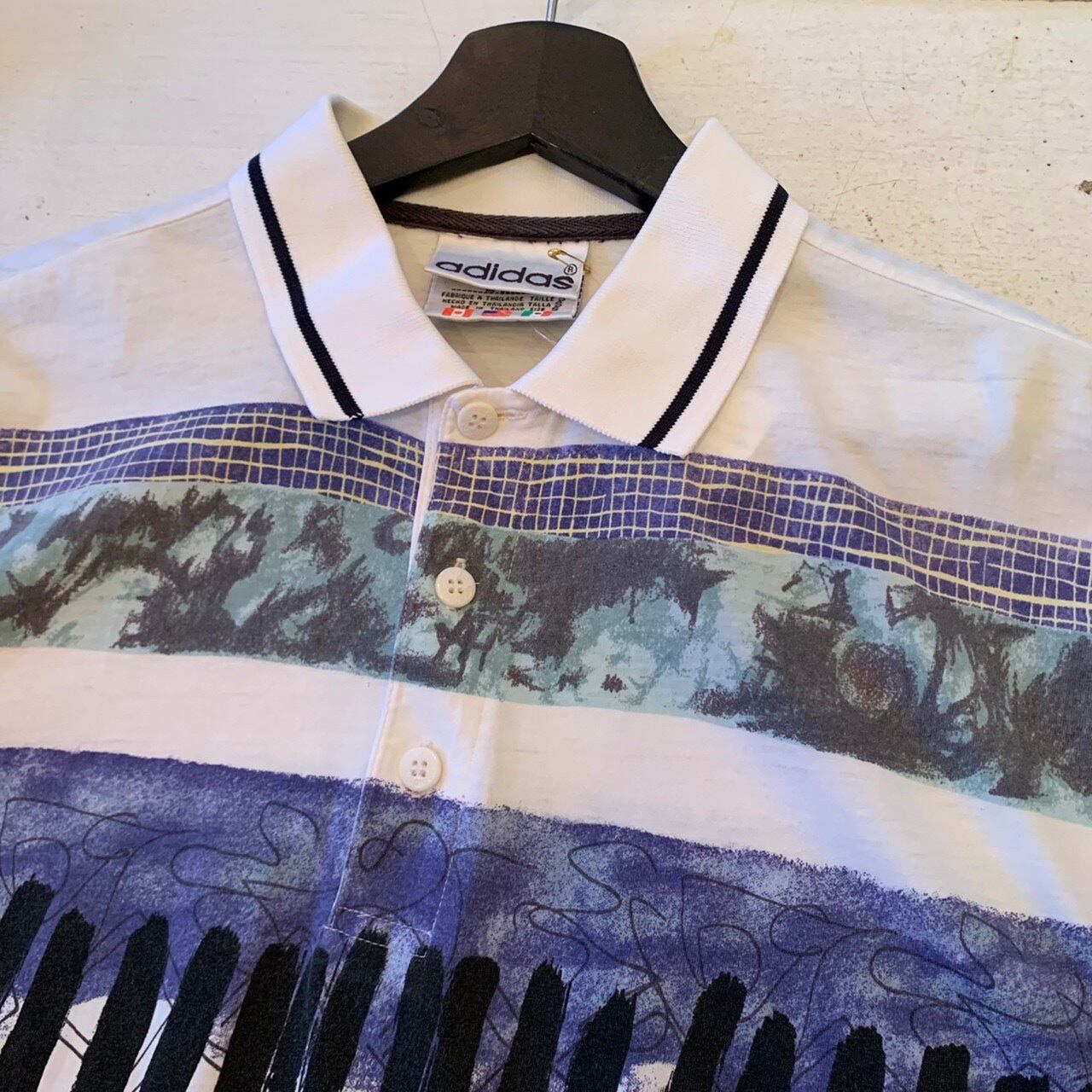 “adidas” 80's~90's white×black base cotton unique pattern S/S polo shirt