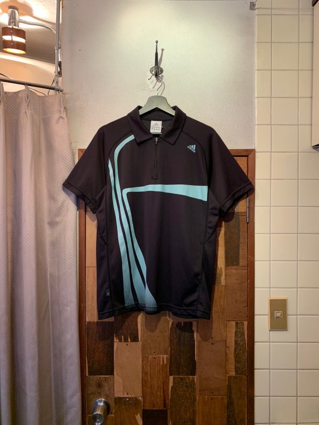 “adidas” 00's~ black×light blue polyester line design S/S zip polo shirt