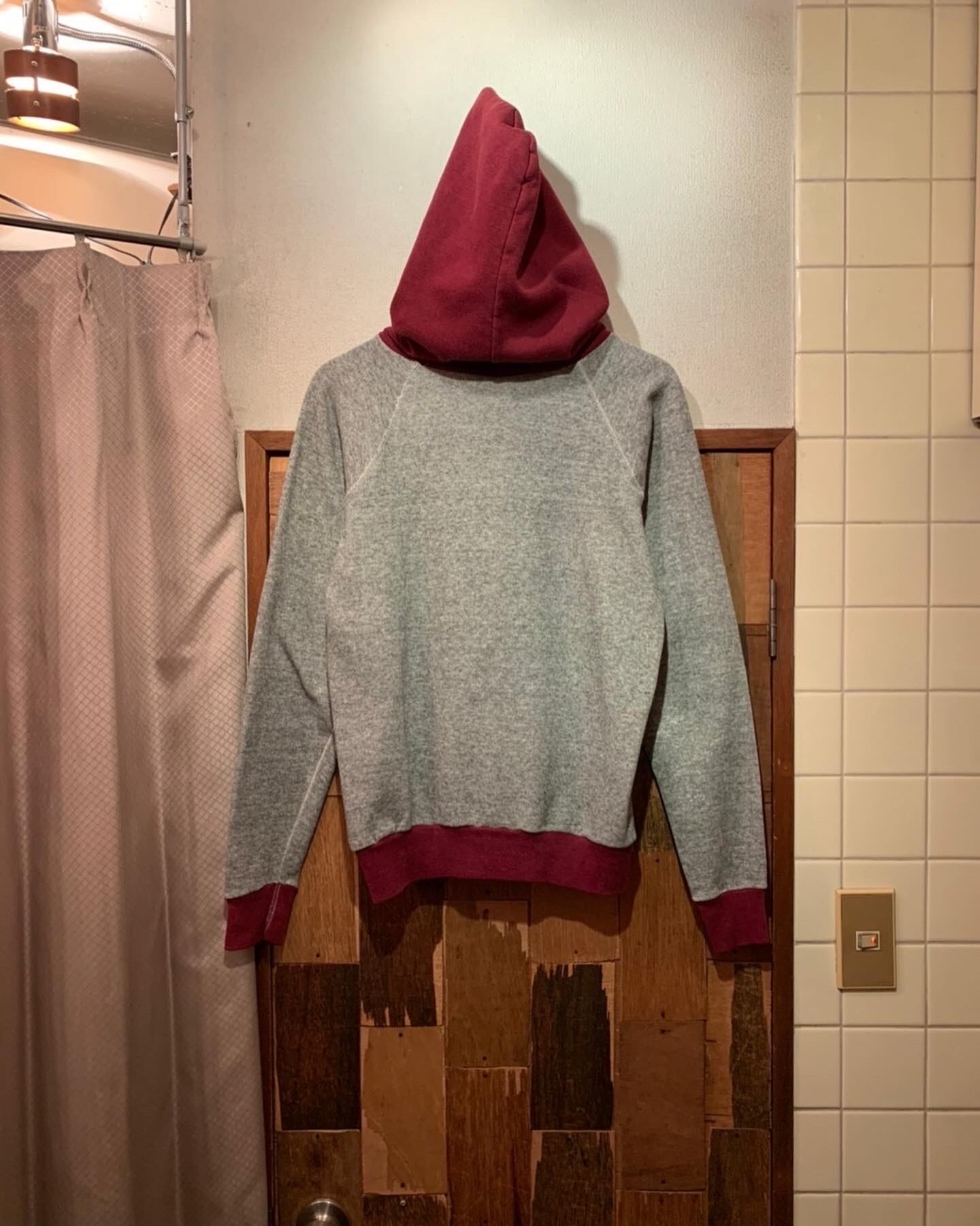 “adidas” 80's made in U.S.A light gray×burgundy poly/cotton/rayon printed hoodie